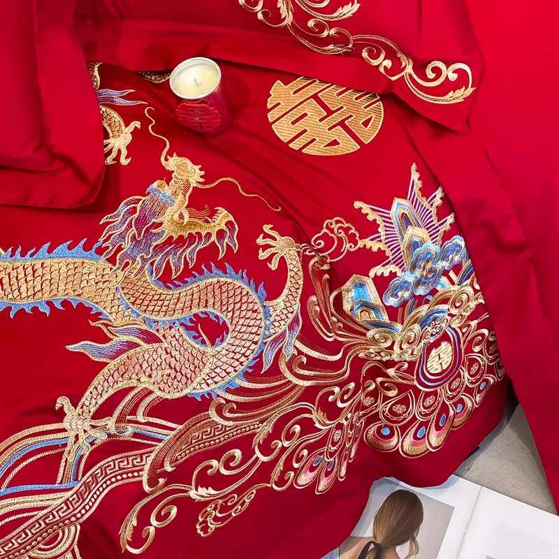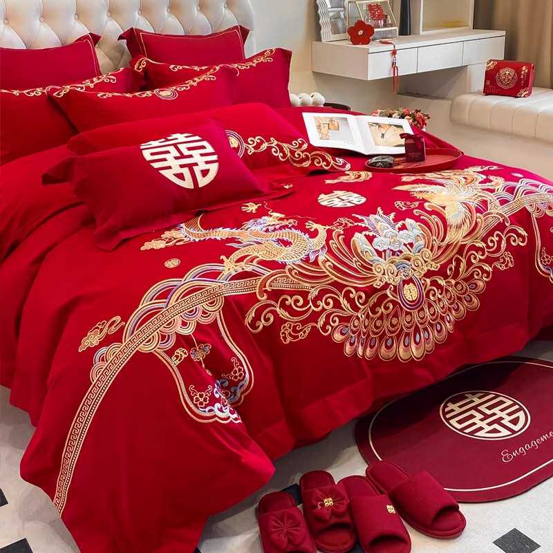 中式龙凤刺绣结婚四件套红色床单被套纯棉新婚庆床上用品婚房喜被