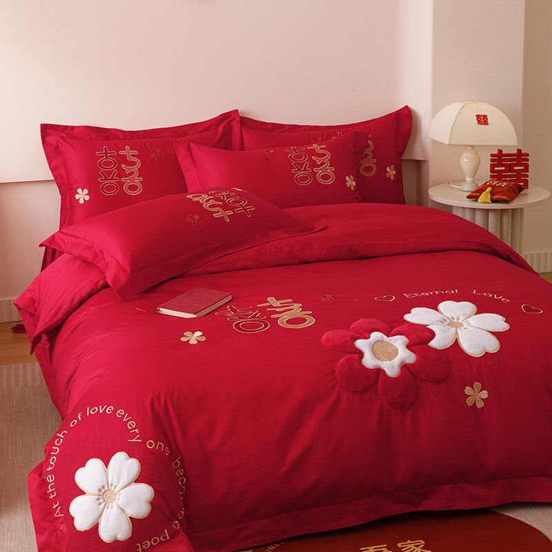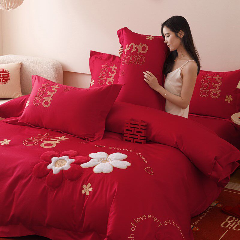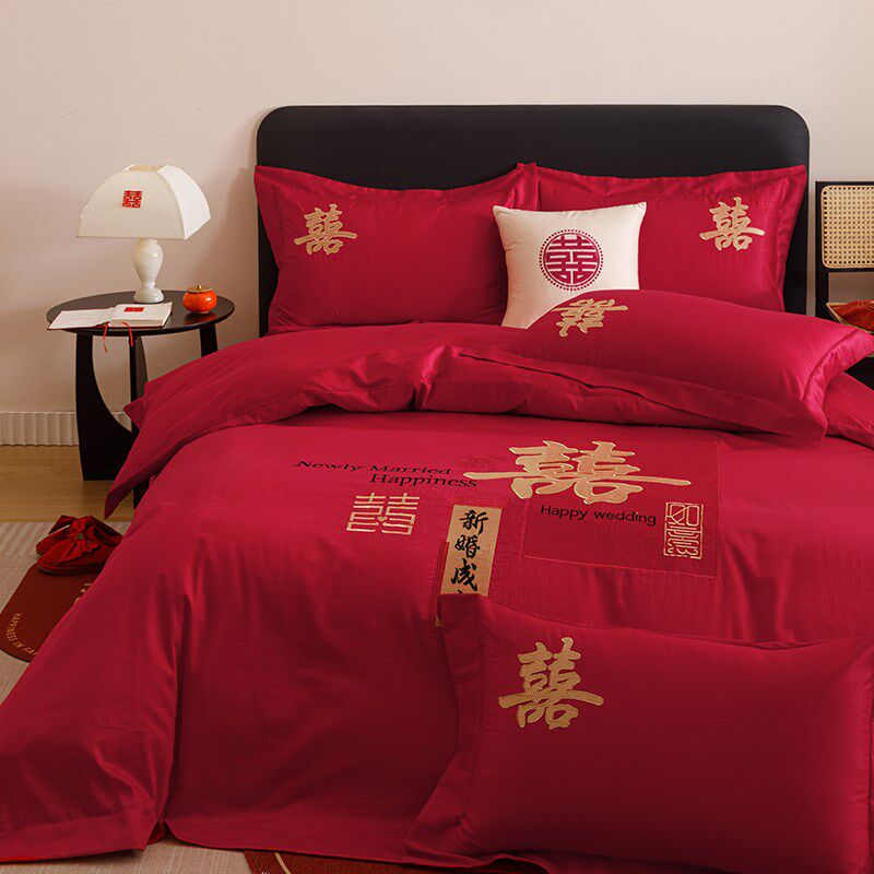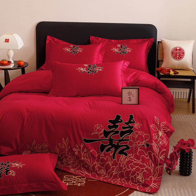 中式结婚四件套大红色刺绣被套床单新婚陪嫁婚庆床上用品