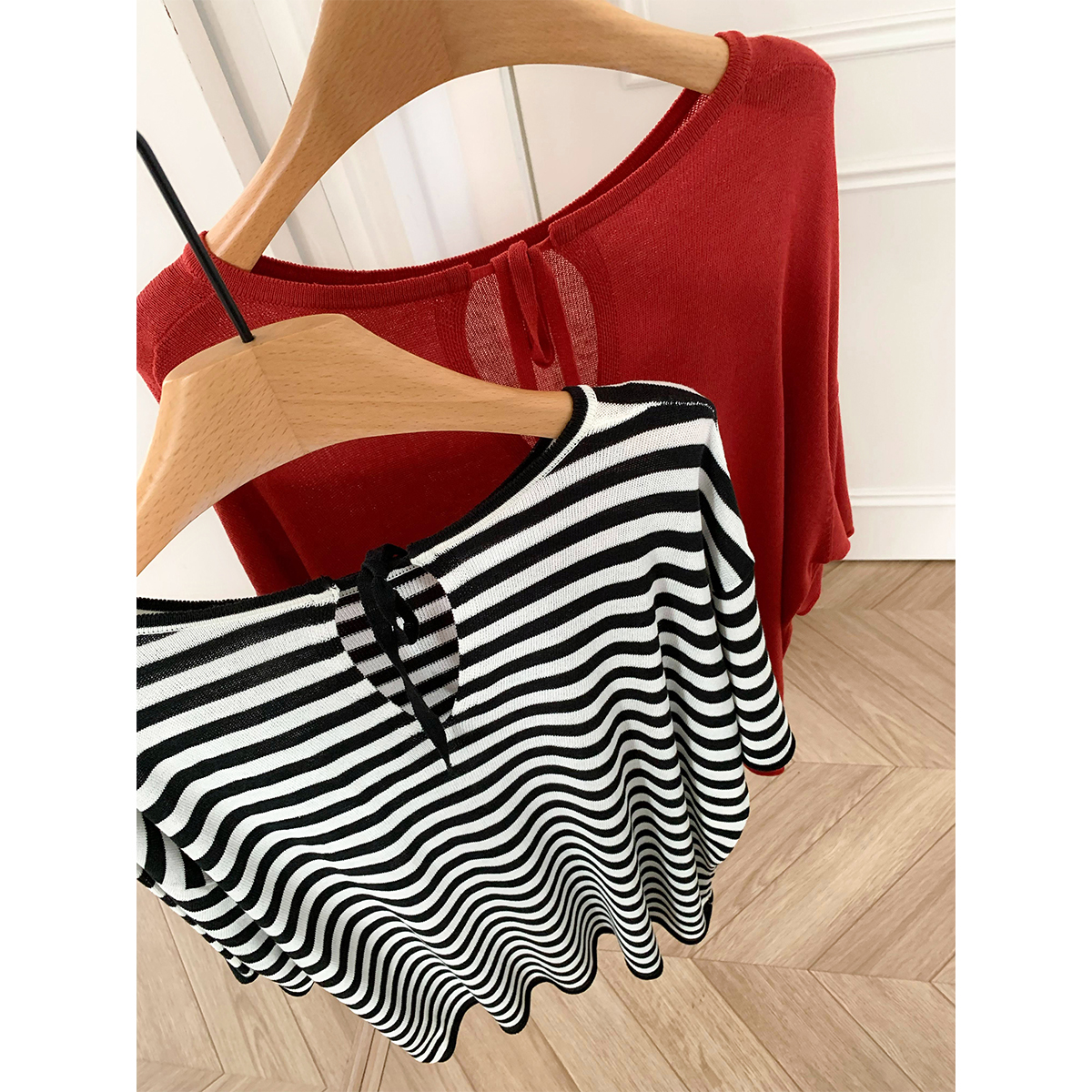 后背绑带 慵懒随意 夏季天爽亚麻针织衫短袖条纹罩衫防晒上衣套头