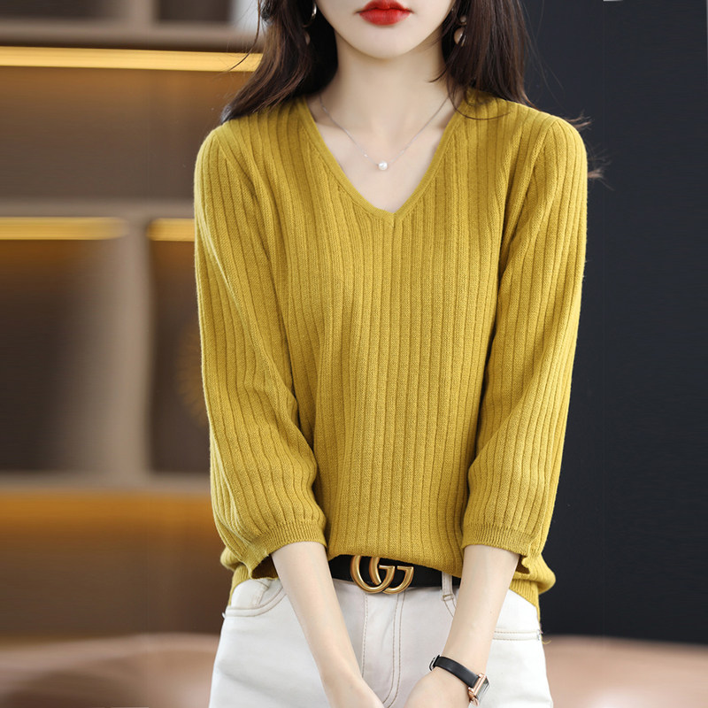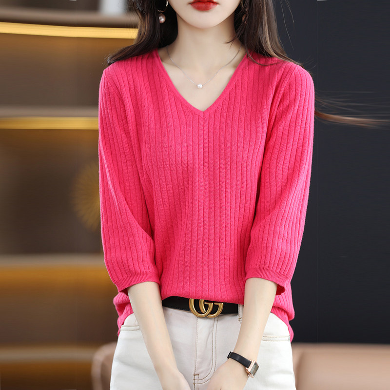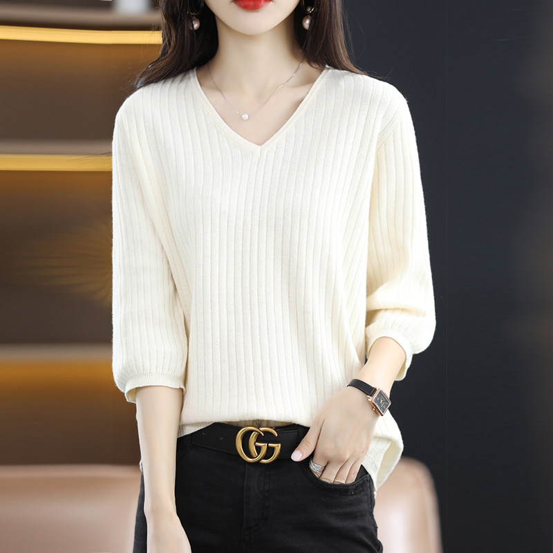 夏季纯棉针织短袖恤女领宽松大码五分中半袖坑条上衣打底衫