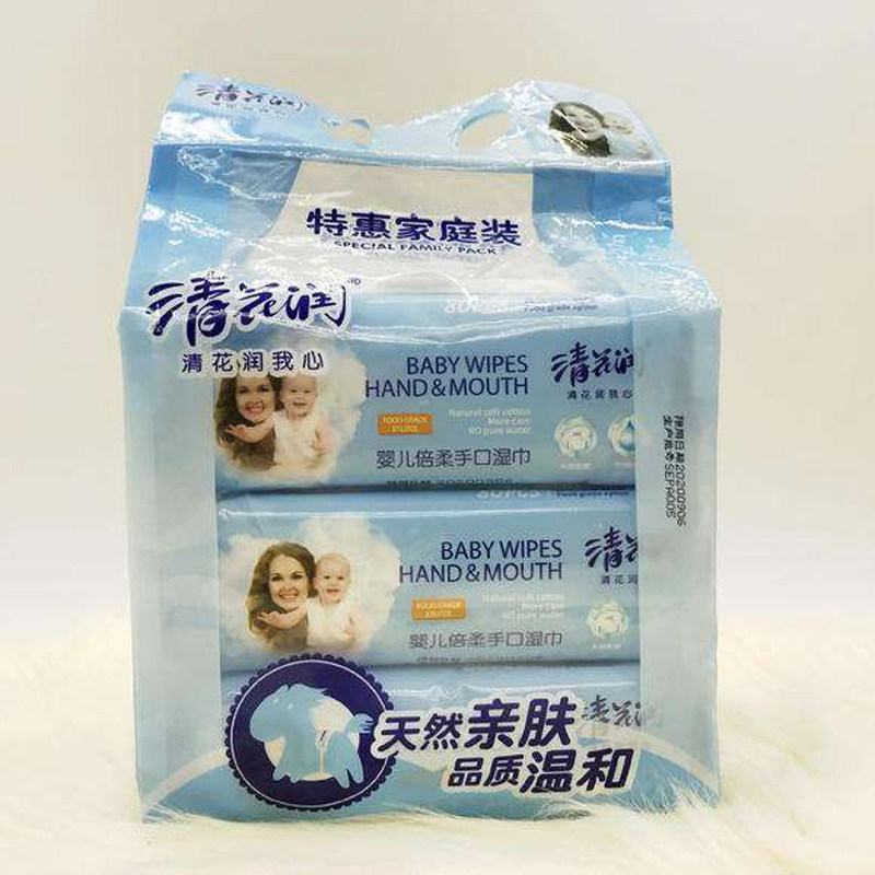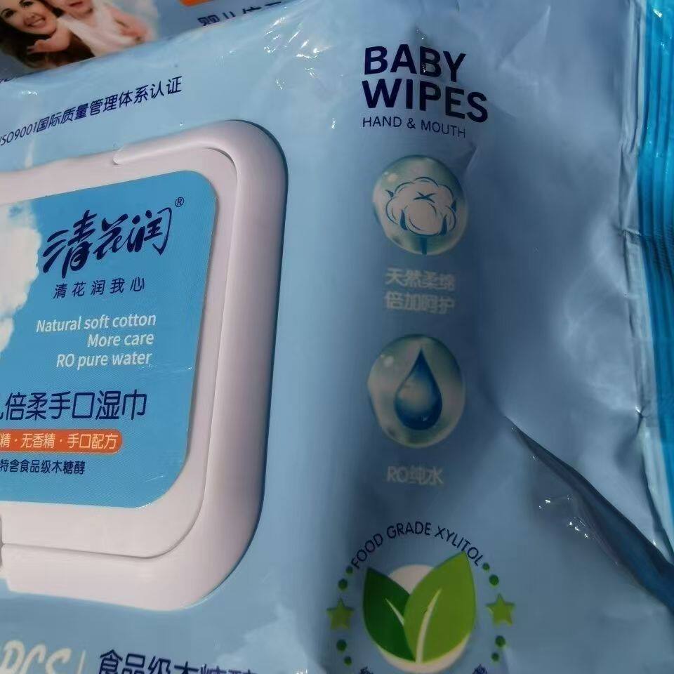 清花润婴儿倍柔手口湿巾80片3包特惠家庭装启封三连包木糖醇无酒