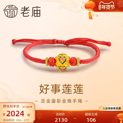 老庙黄金足金鎏彩好事连连莲花金珠红手绳古法硬金古典吉祥新中式