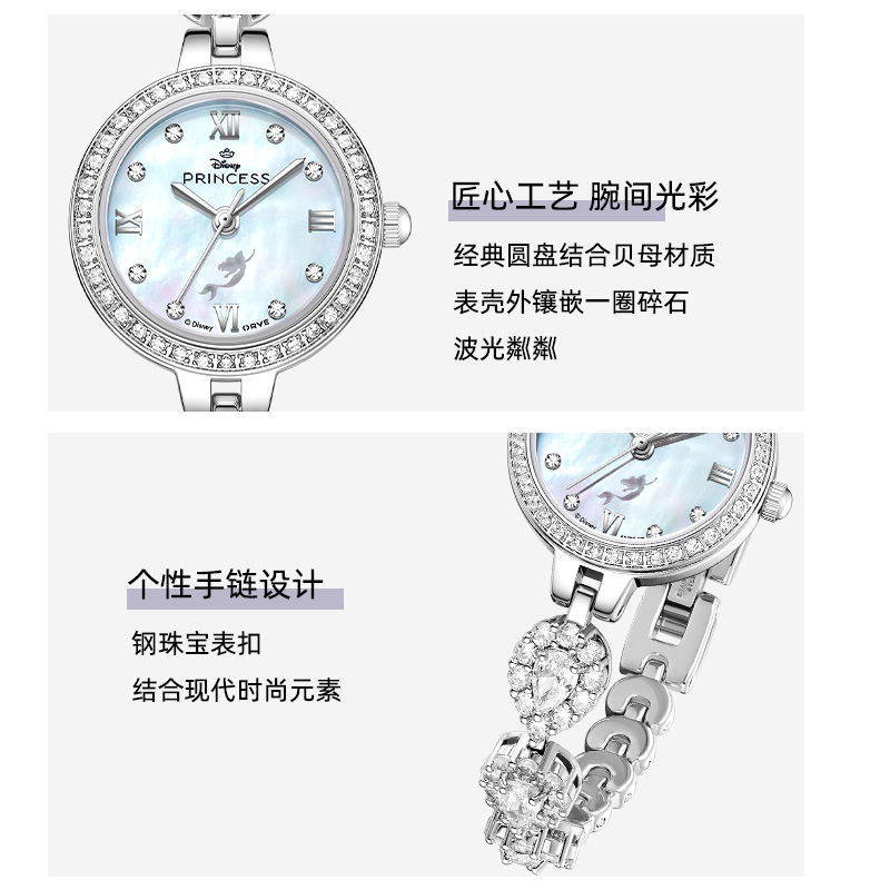 迪士尼公主满钻璀璨锆石镶嵌美人鱼手链腕表礼盒甜美手表女生手表