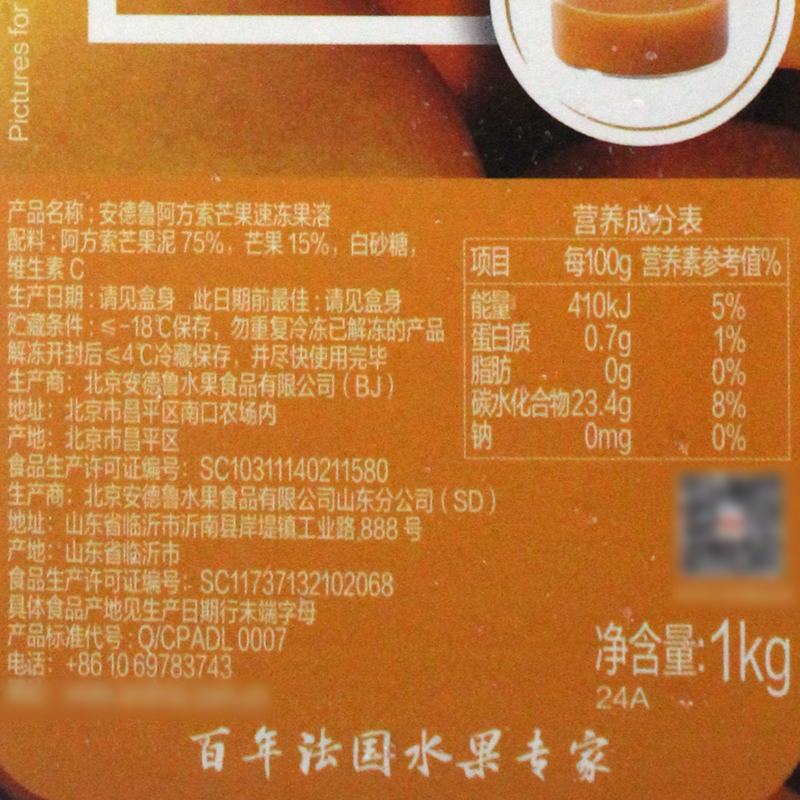 安德鲁阿方索芒果果溶1kg速冻果泥冷冻芒果果茸果酱果蓉蛋糕原料