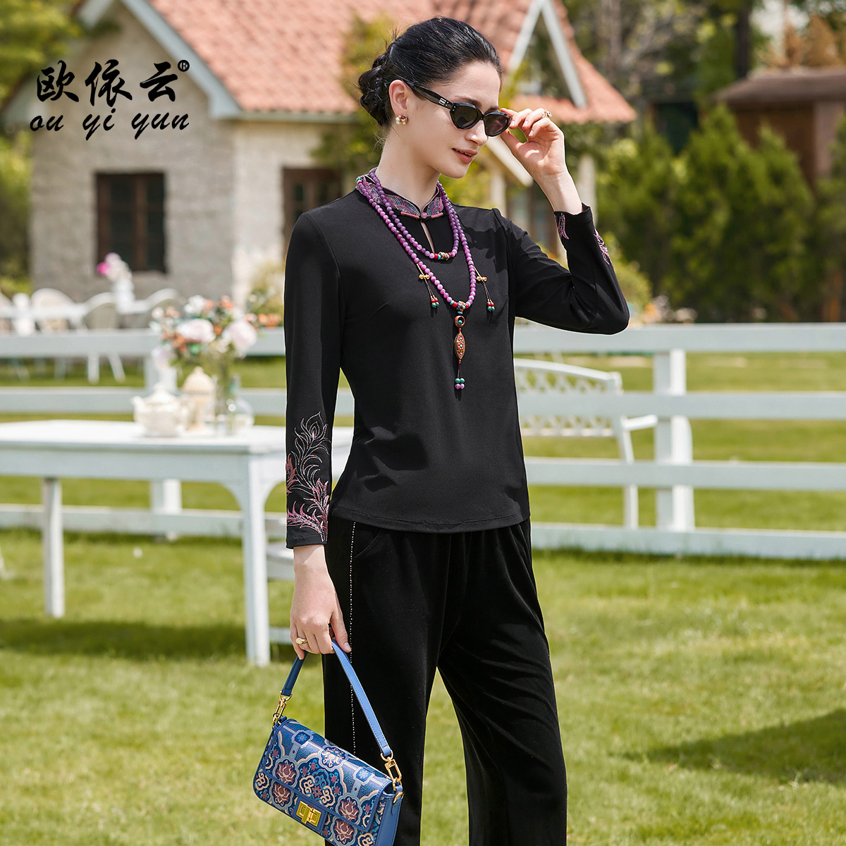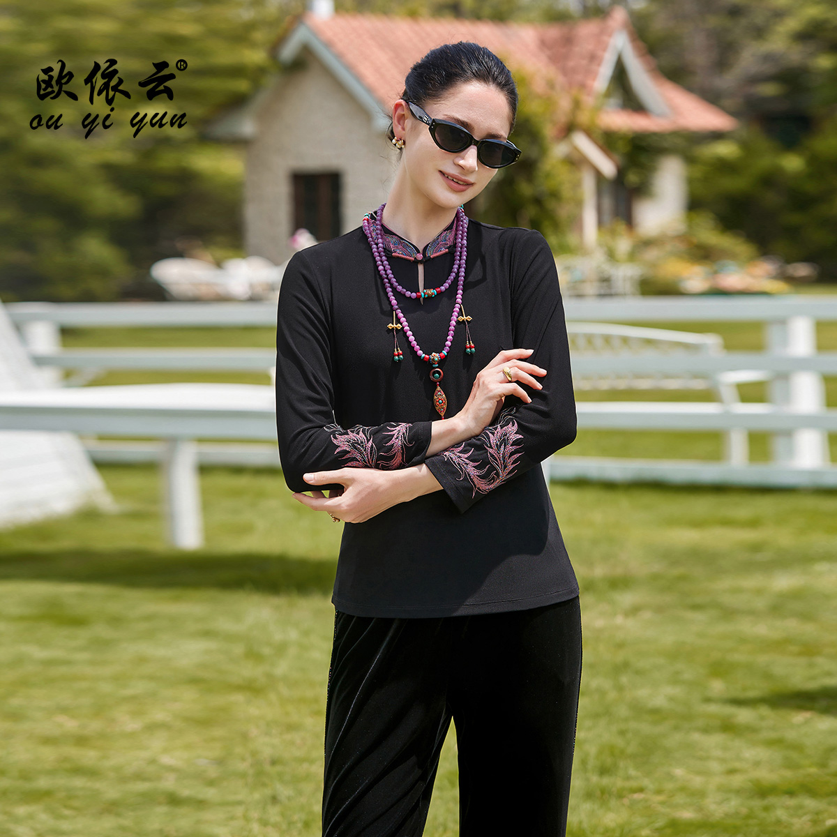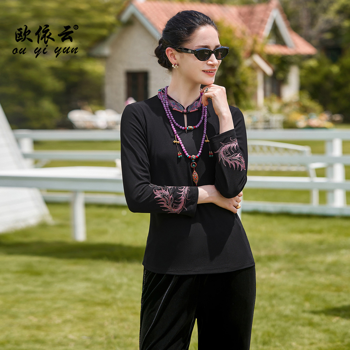欧依云中年妈妈秋装气质上衣女衫显瘦时尚刺绣长袖打底衫2025新款