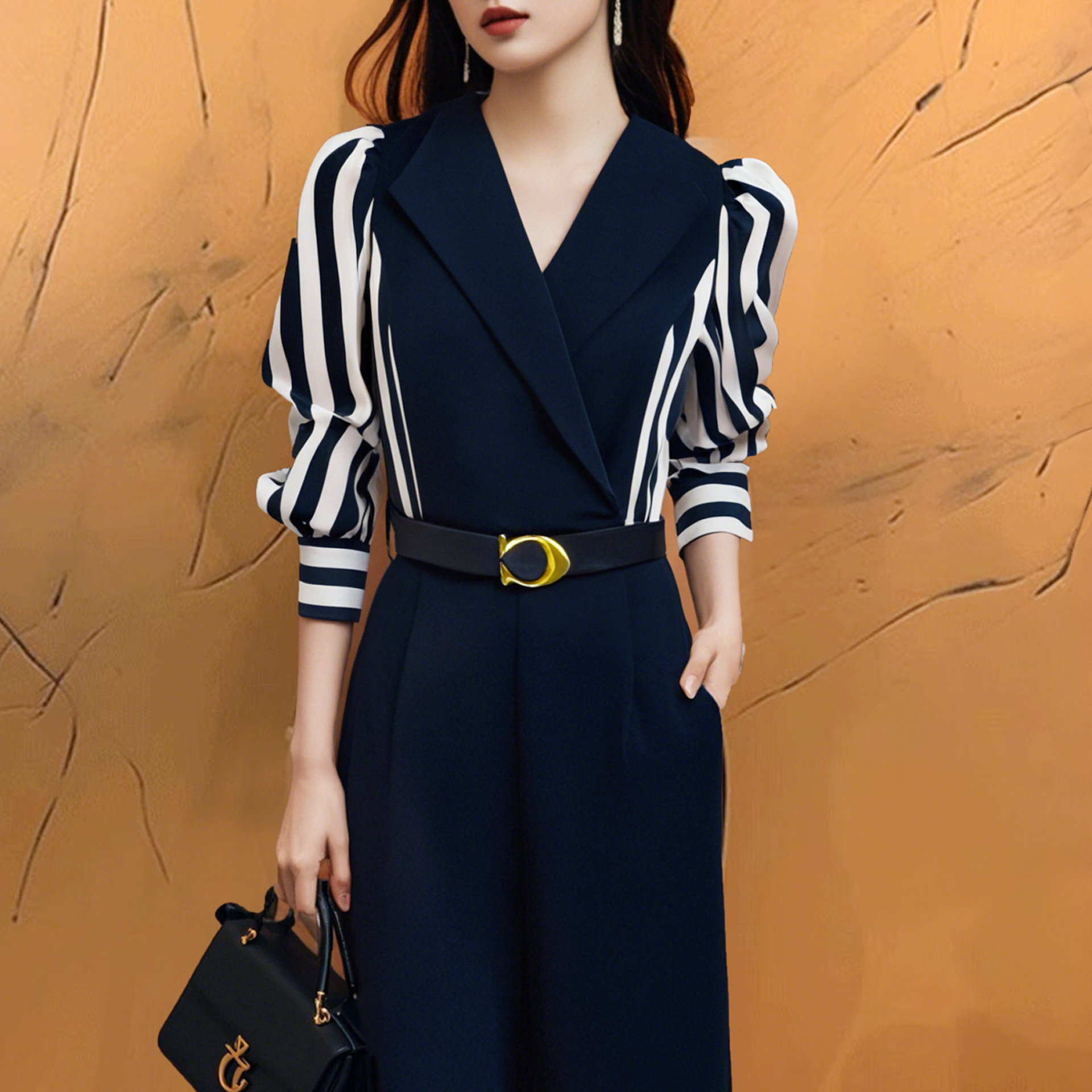 【送腰带】2025春季新款气质通勤条纹拼接高腰系带连体裤女D0522