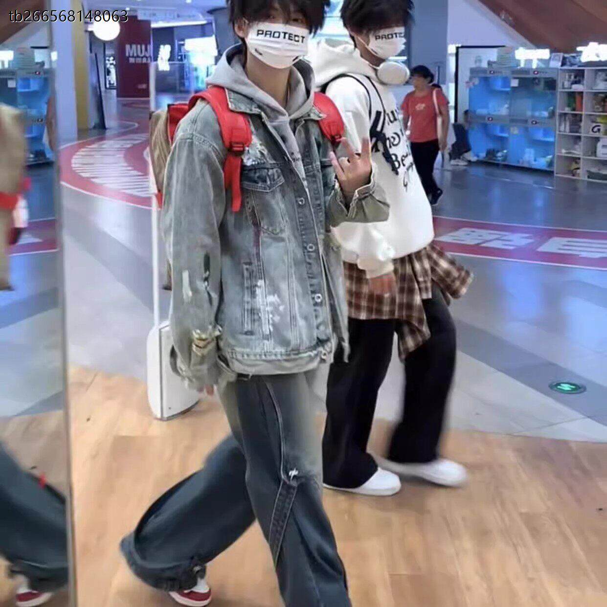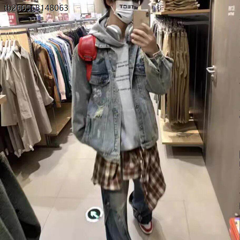 美式扎染破洞牛仔外套男春秋季新款宽松bf高街学院风情侣夹克痞帅