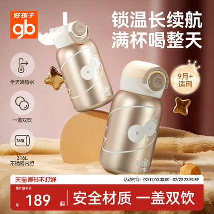 gb好孩子新款儿童保温杯便携双饮吸管水杯大容量卡通学生专用水壶
