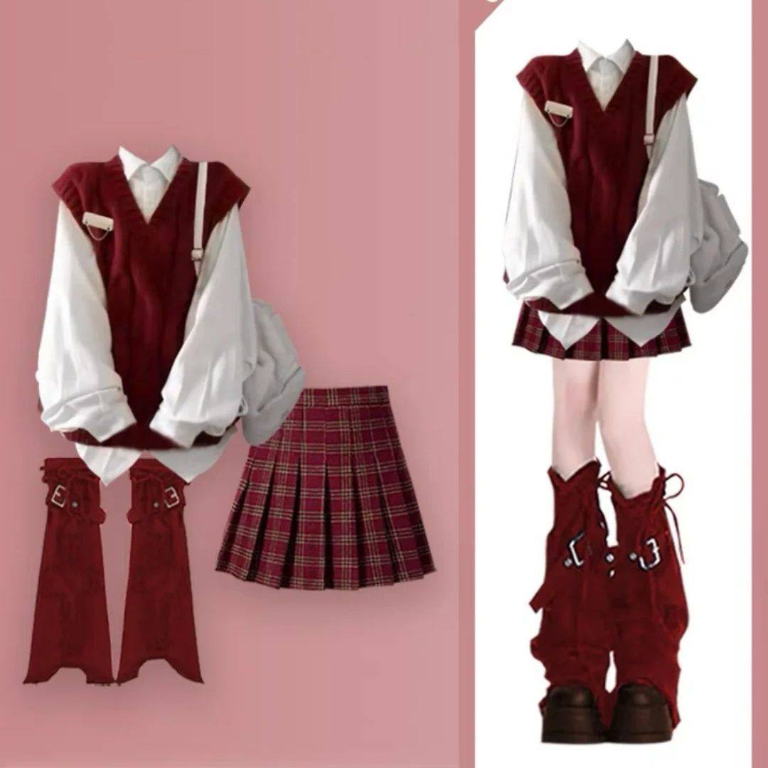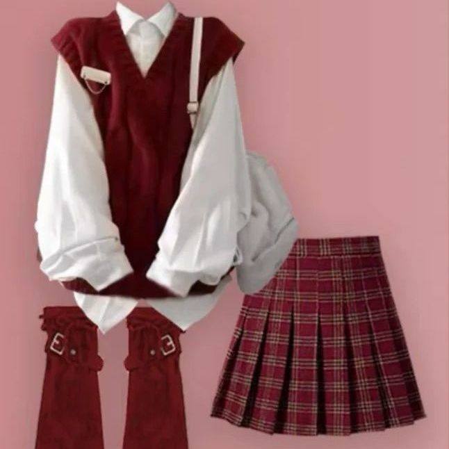 圣诞新年战袍韩版宽松长袖衬衫+针织马甲背心高腰百褶裙三件套潮