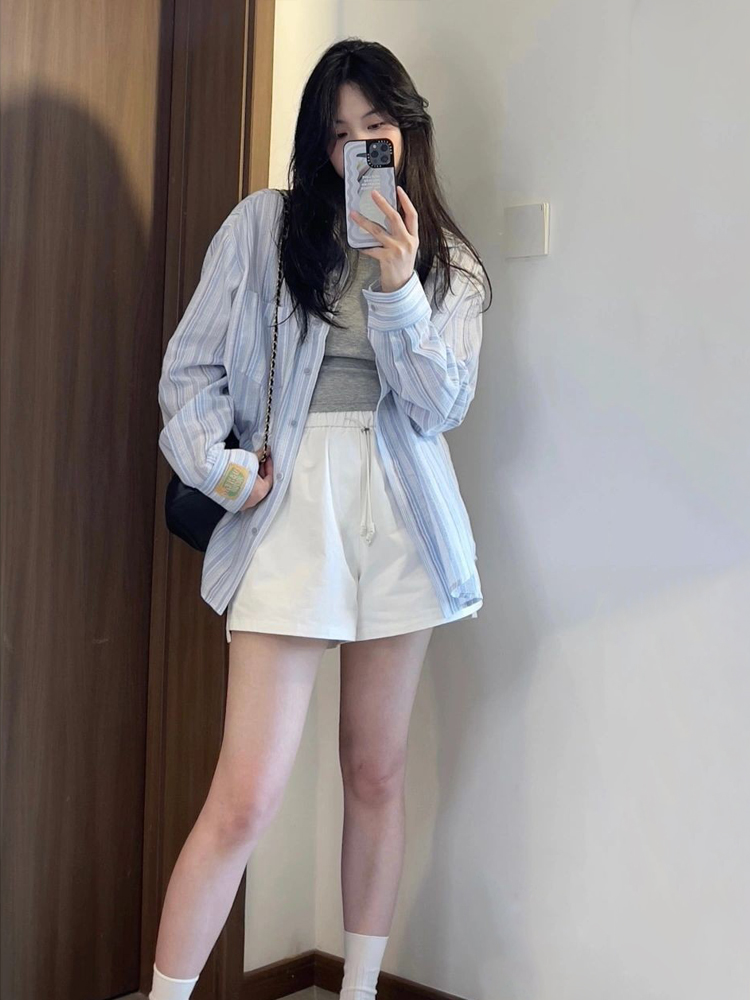 2025春秋新款甜美气质上衣女宽松慵懒长袖蓝色条纹休闲衬衣薄外套