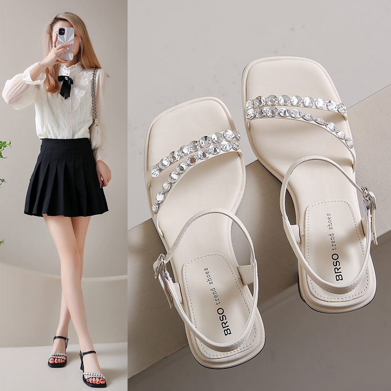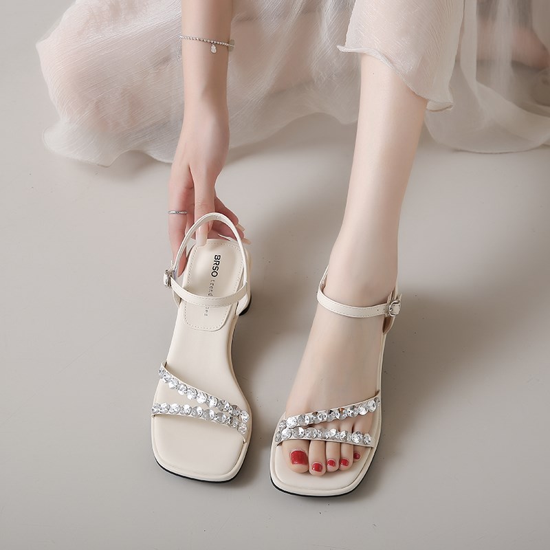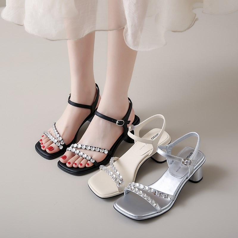 舒适粗跟不累脚水钻凉鞋女一字带仙女鞋2025夏R季新款配裙子高跟
