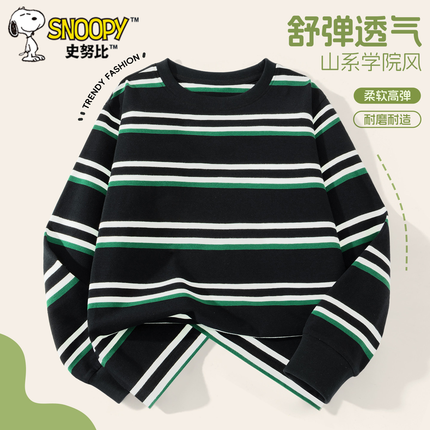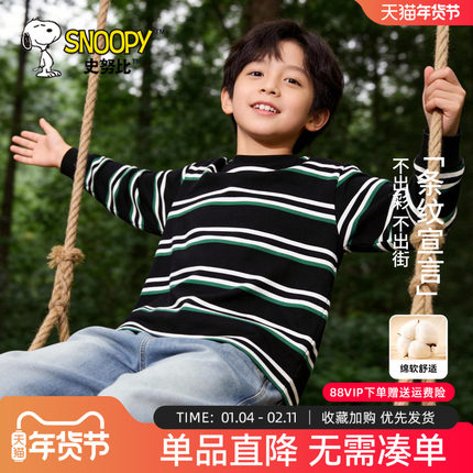 史努比男童长袖t恤黑色条纹上衣春秋季2026新款打底衫儿童衣服潮