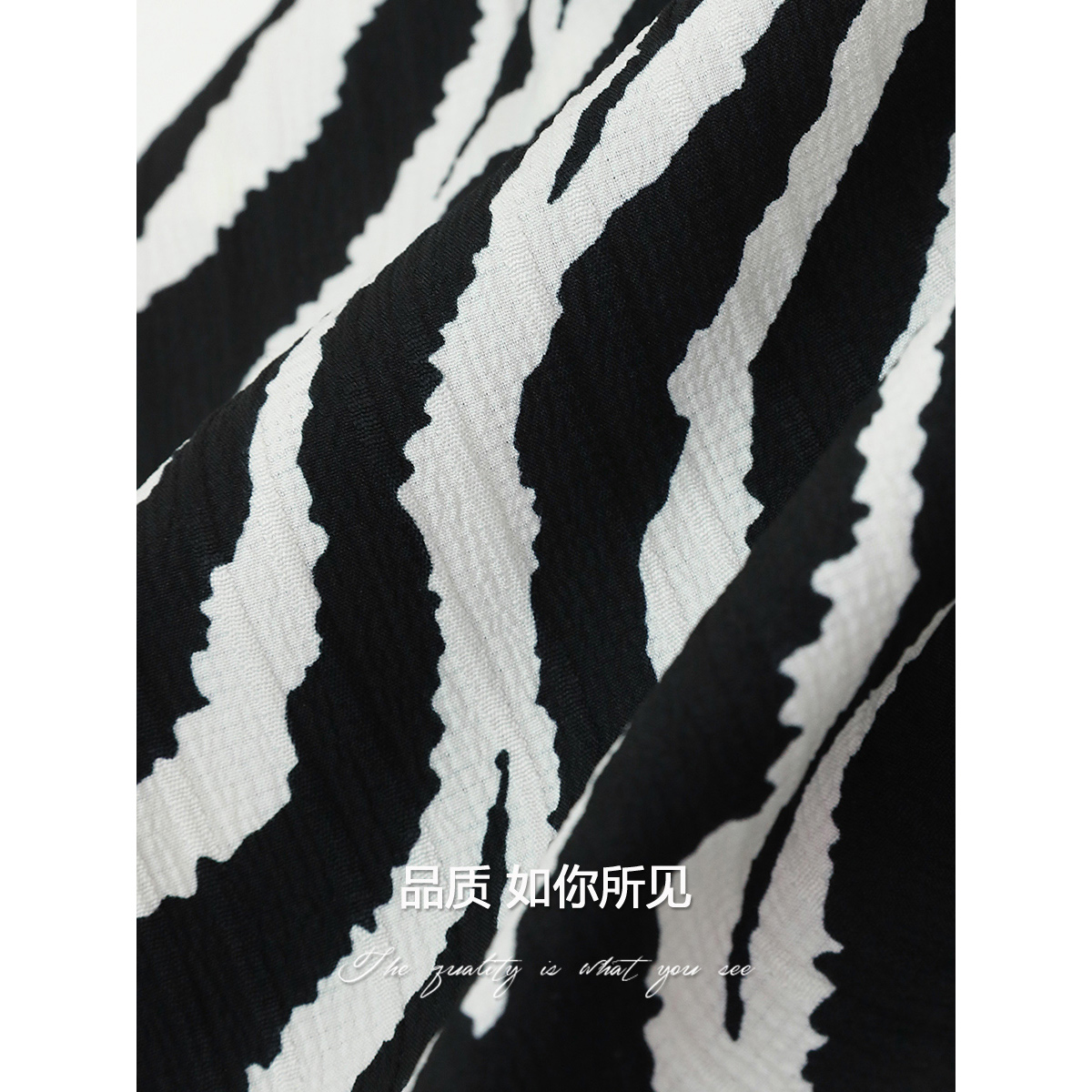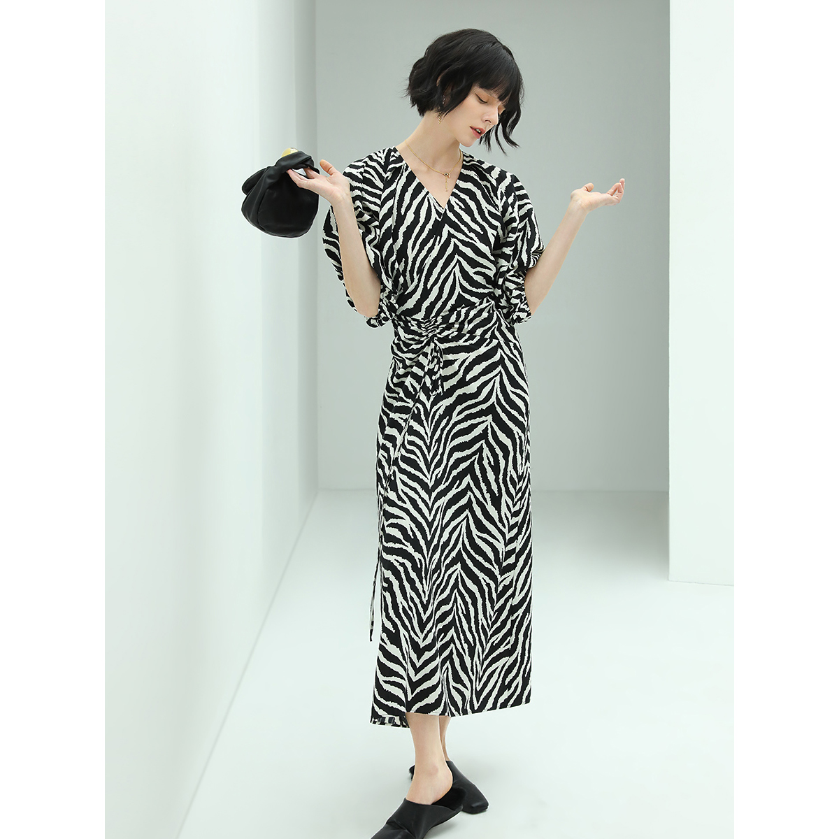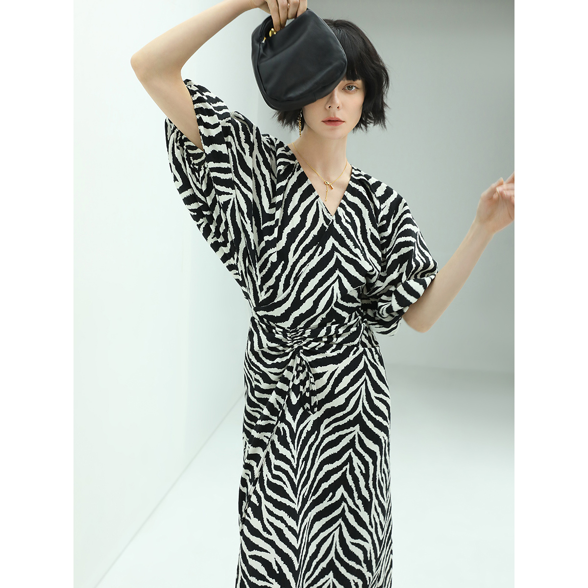 【3件5折】COCOBELLA设计感抽褶斑马纹连衣裙女气质V领长裙FR911