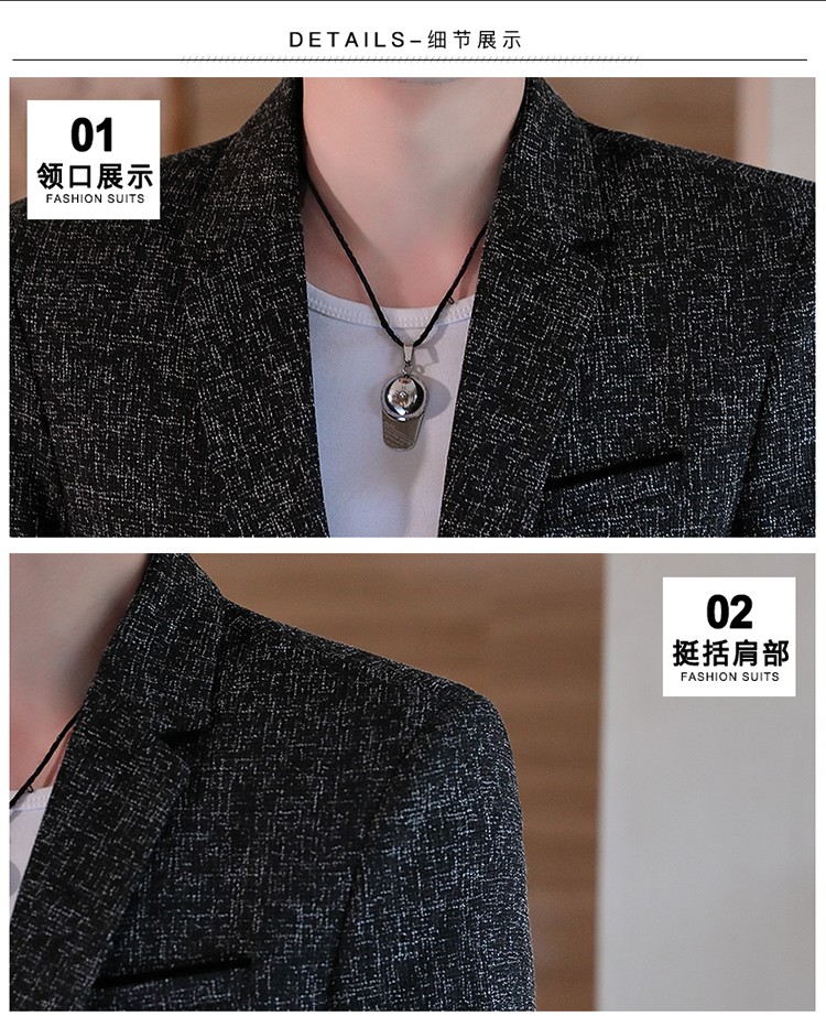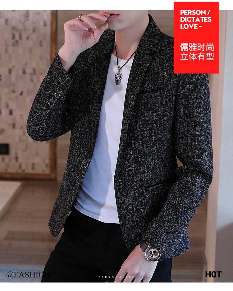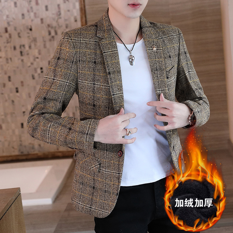 男士休闲小西装春秋冬季加绒款韩版修身格子西服痞帅单西外套潮流