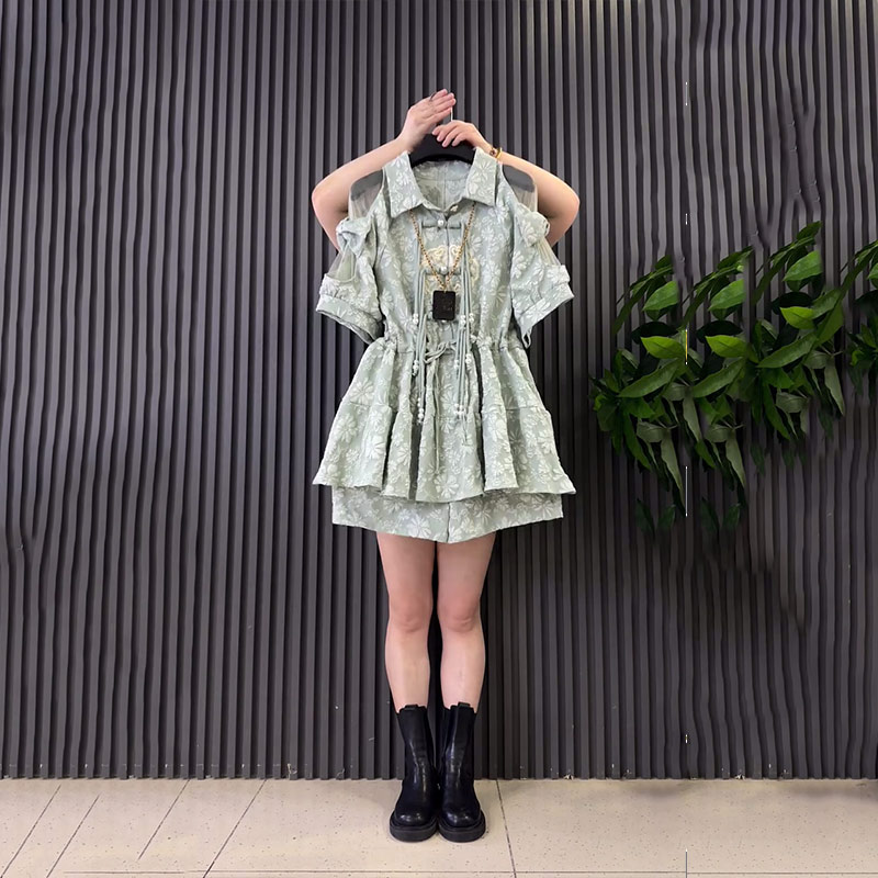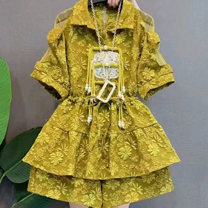 胖妹妹翻领蕾丝肩流苏扣收腰上衣短裤大码女装法式花朵国风两件套