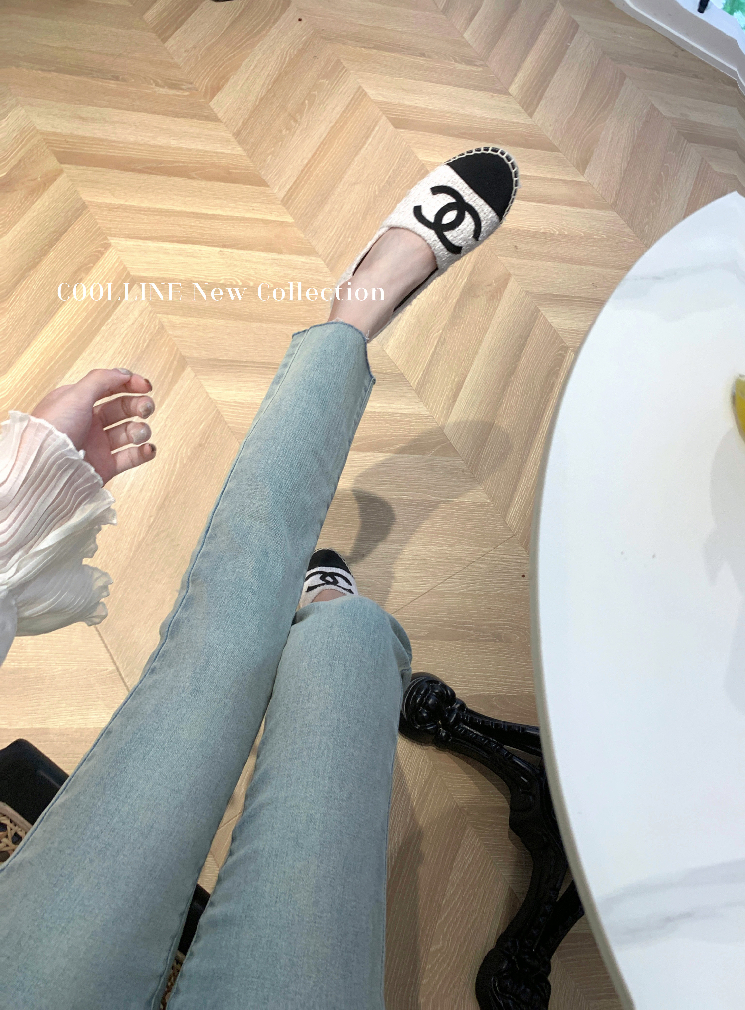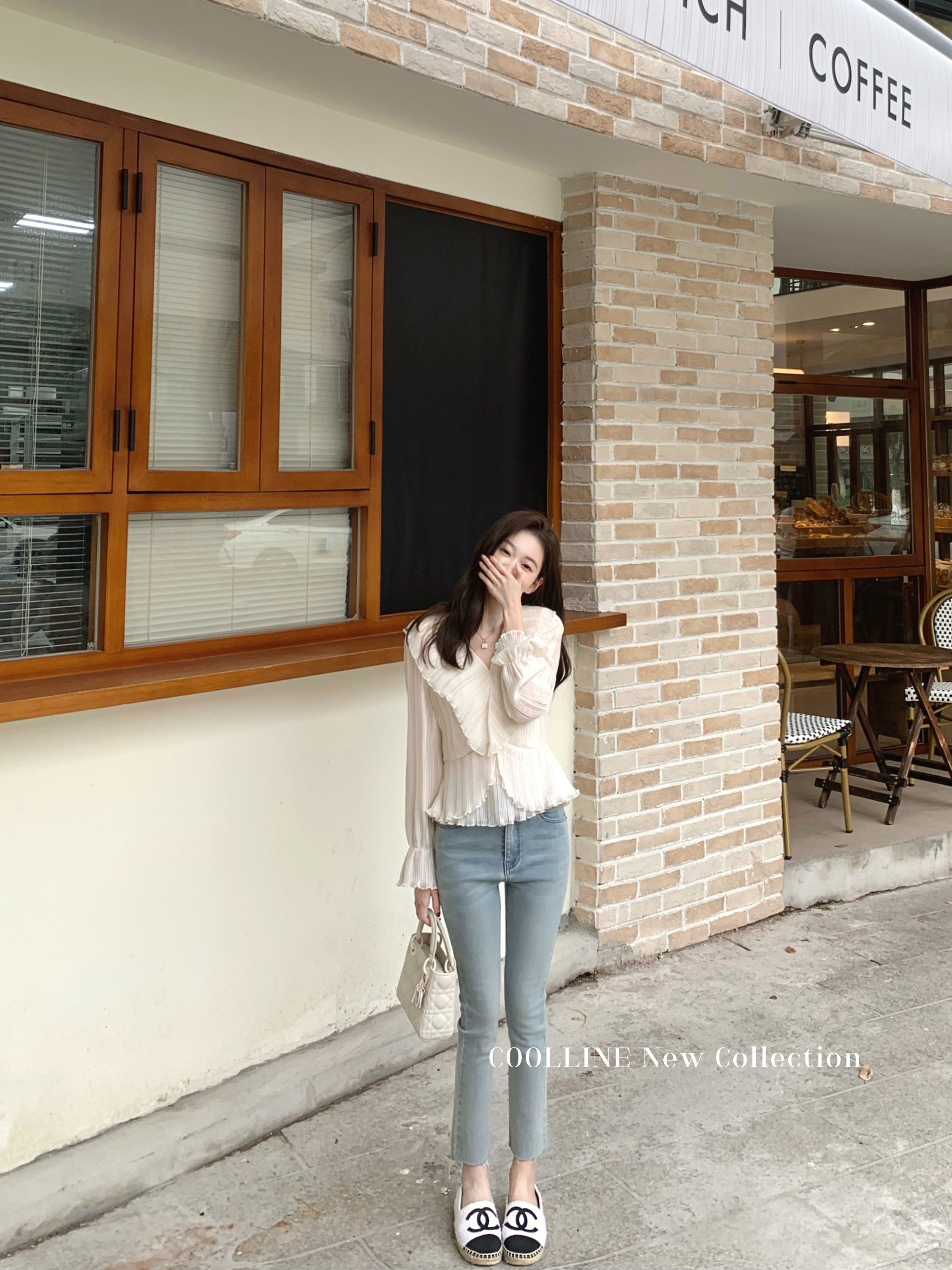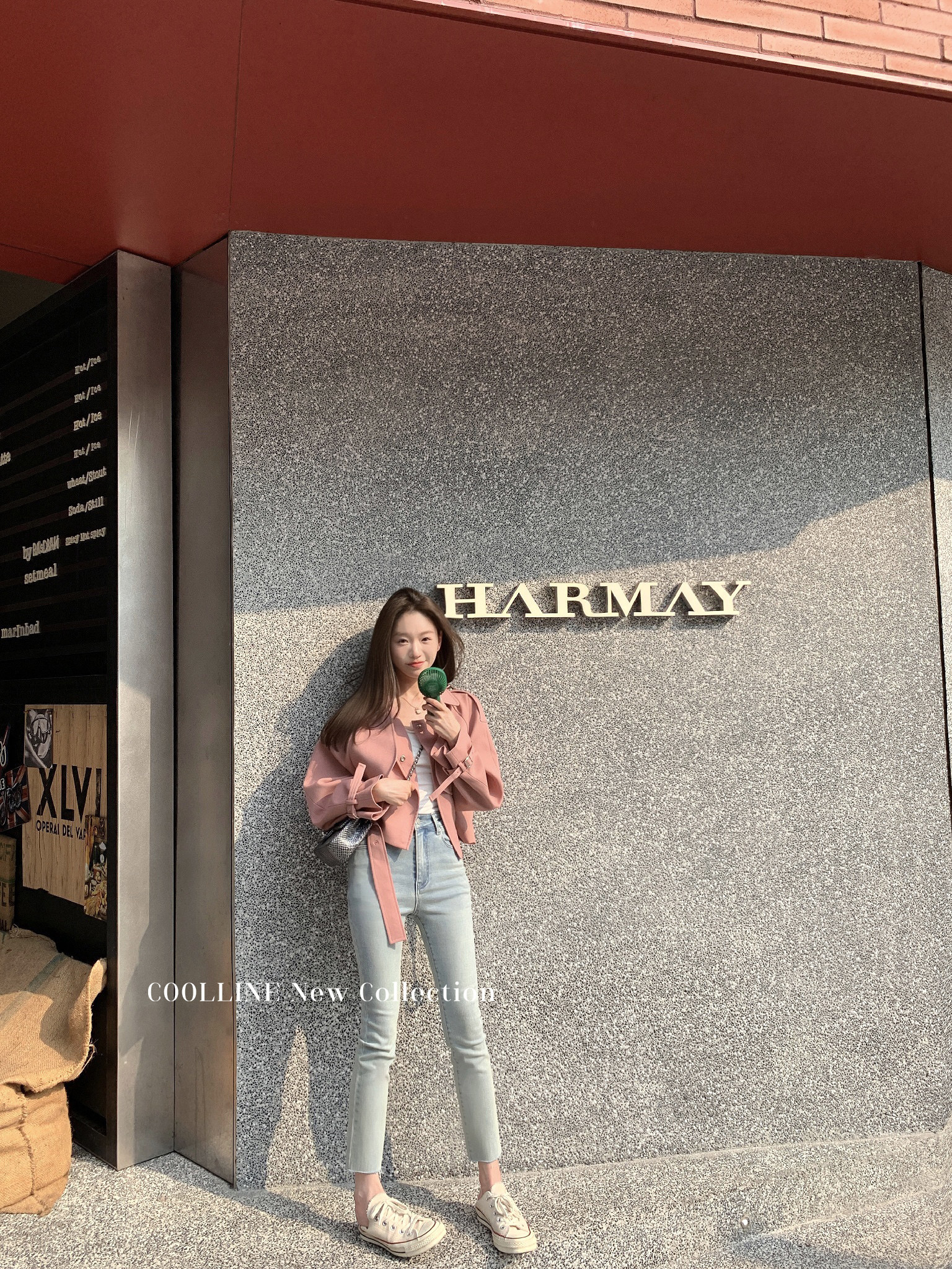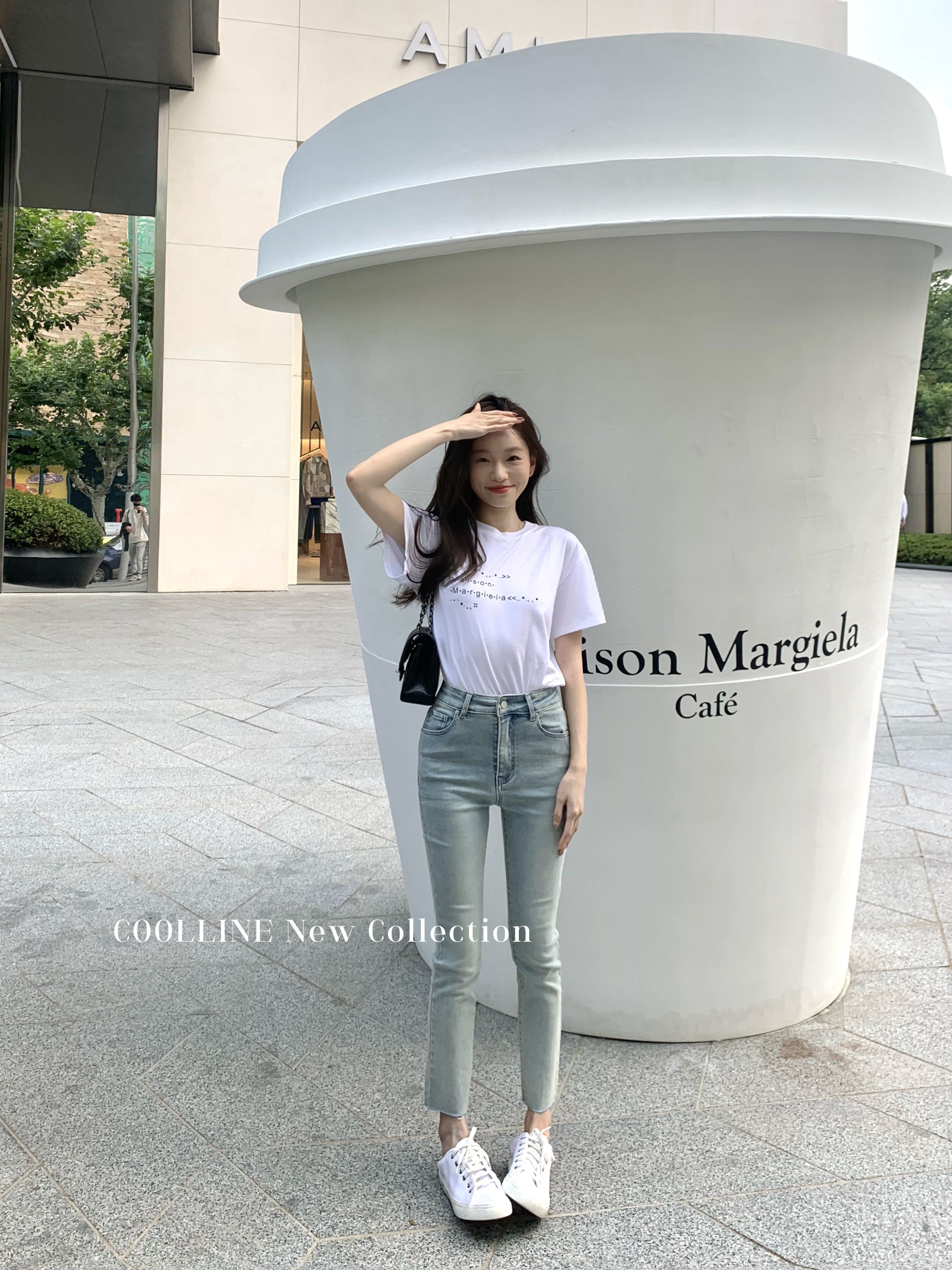COOLLINE林子熙 毛边弹力浅蓝色高腰牛仔裤女修身微喇直筒九分裤