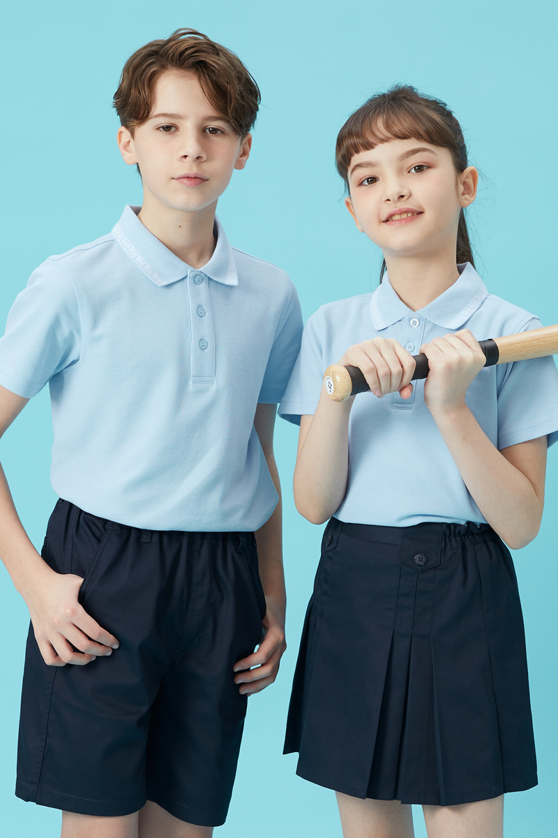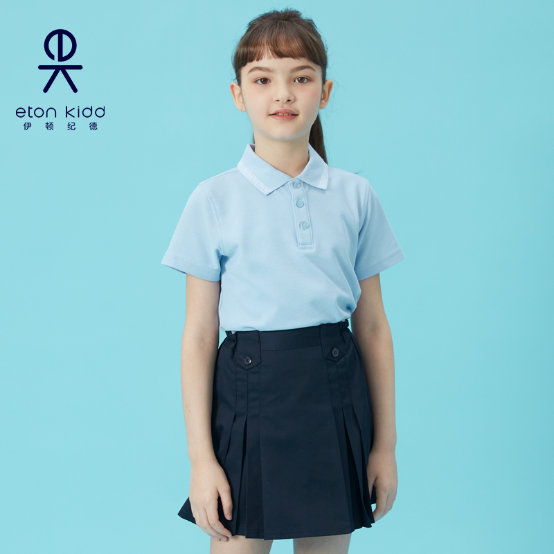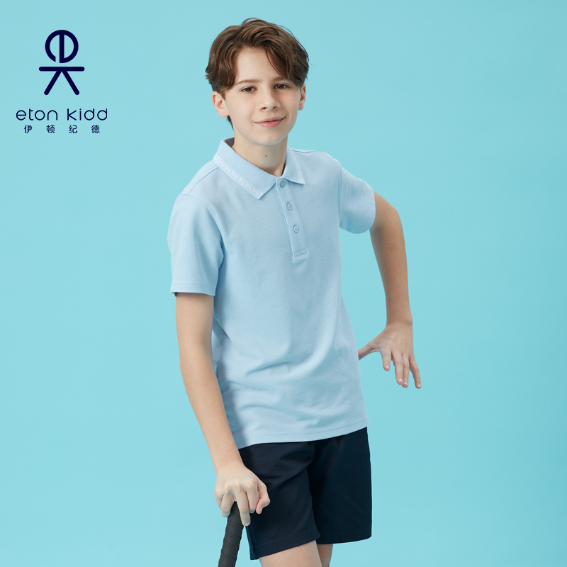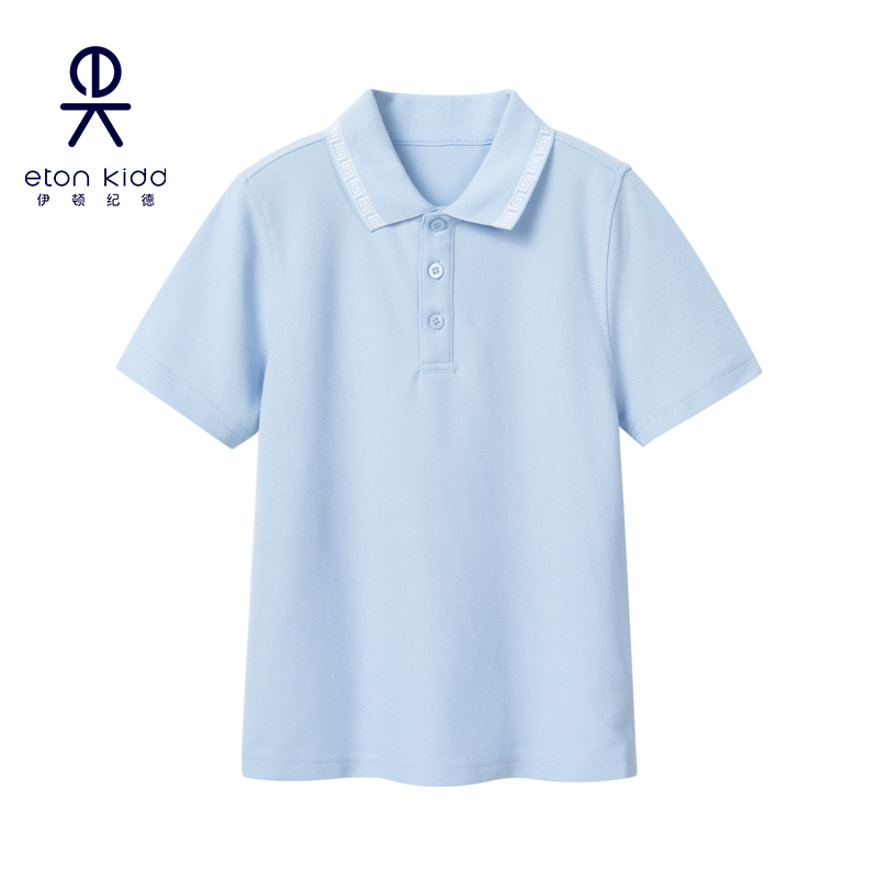 伊顿纪德男女童中式撞色回纹领浅蓝T恤儿童装短袖polo衫21T0050惠