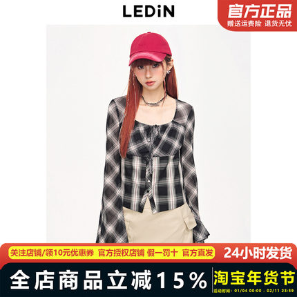 乐町2024夏新款方领格纹拼接小个子雪纺衫C2CDE2144