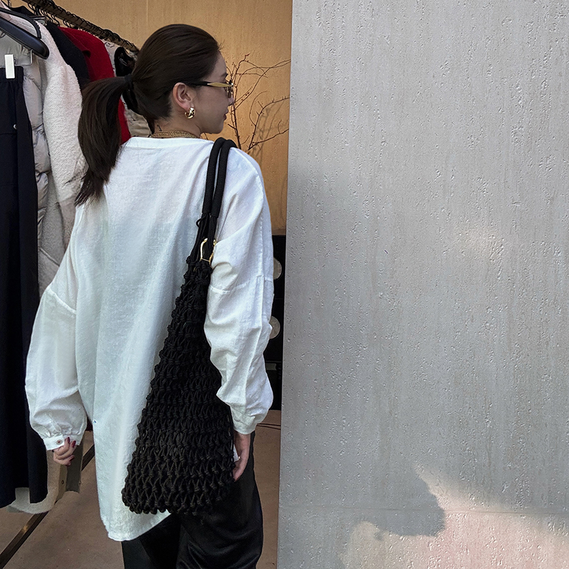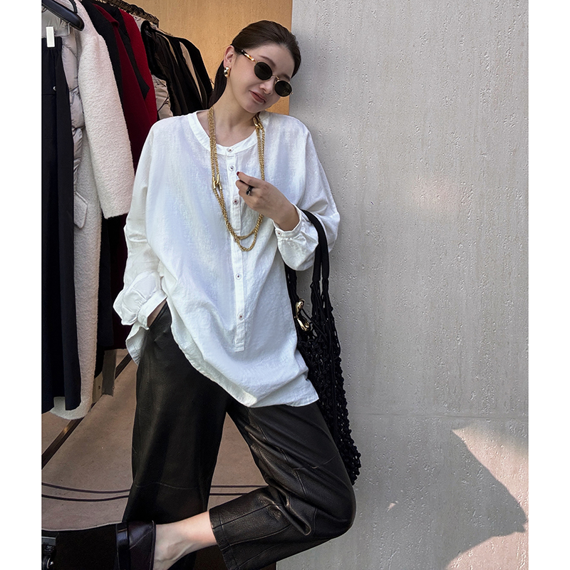 CHU楚妞[花舍]苎麻白色圆领长袖衬衫春季新款女法式简约上衣