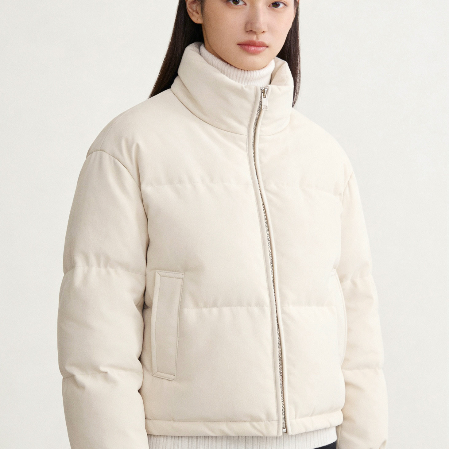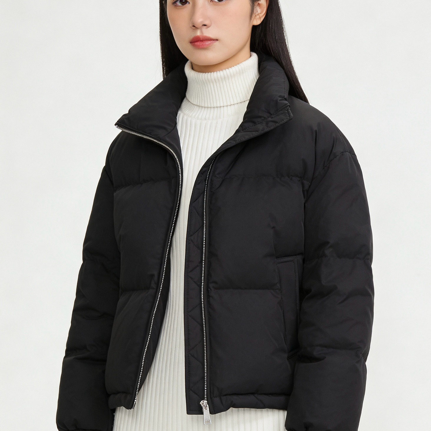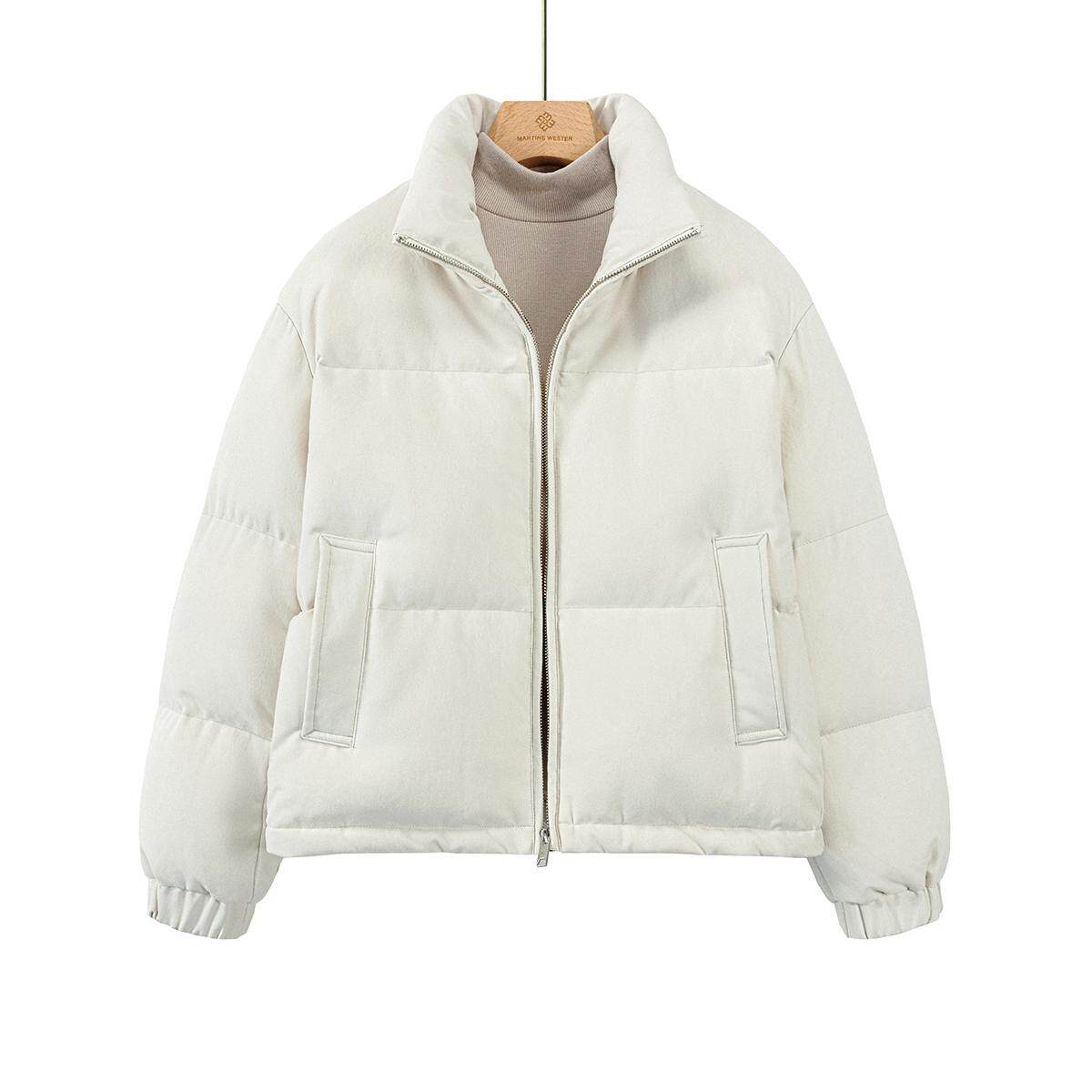 冬季玛汀 时髦立领仿毛感中空纱90鹅绒拒水厚款宽松短款羽绒服女