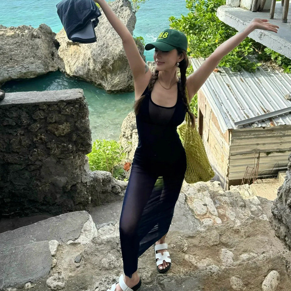 批发网红同款辣妹深蓝色透视沙滩网纱长裙罩衫性感黑色比基尼泳衣