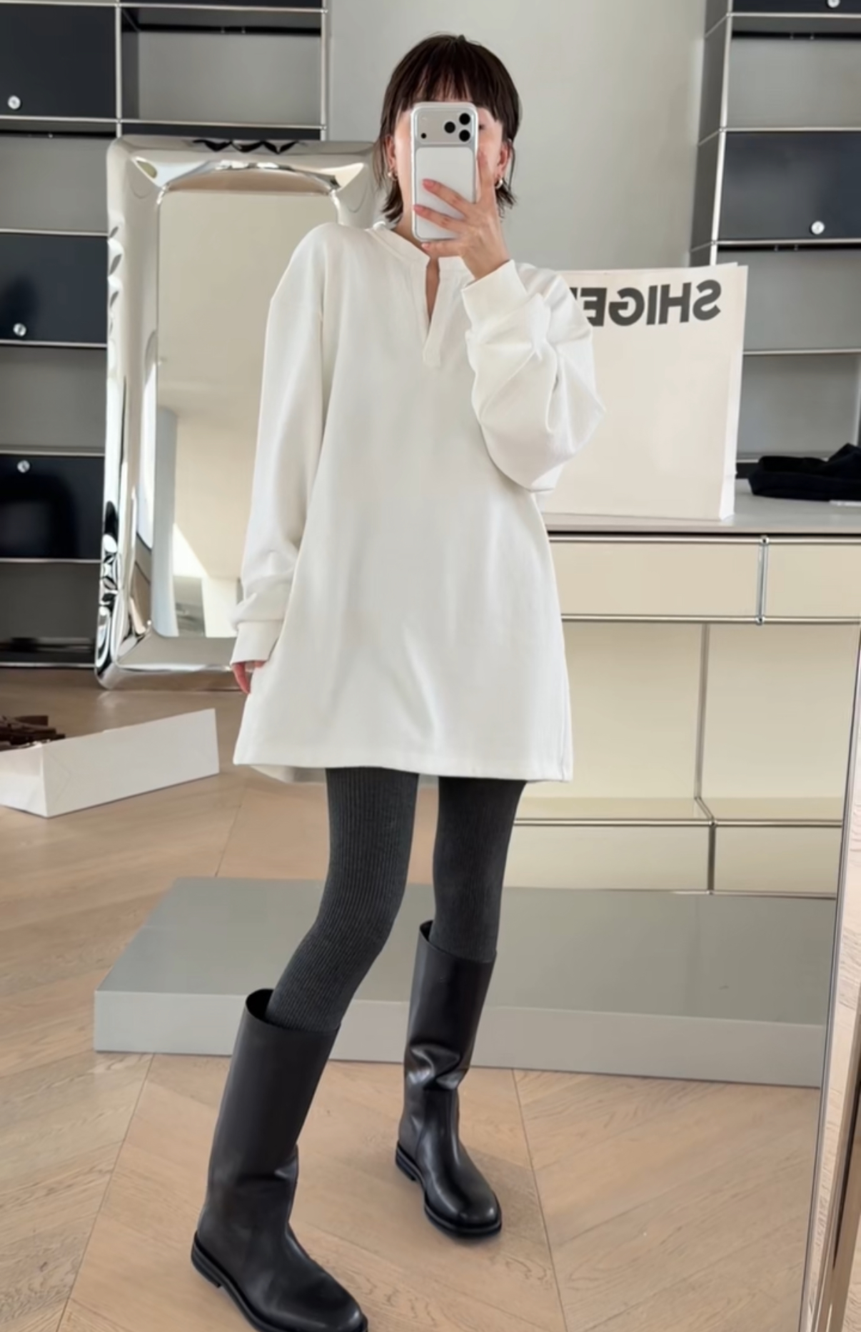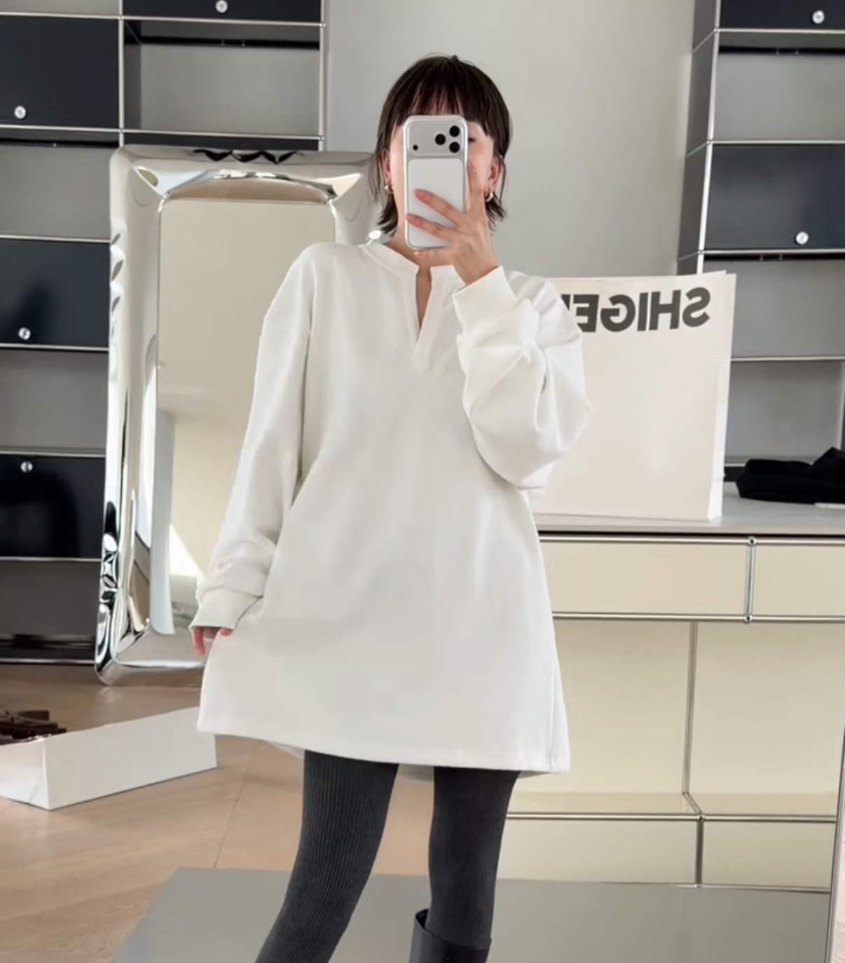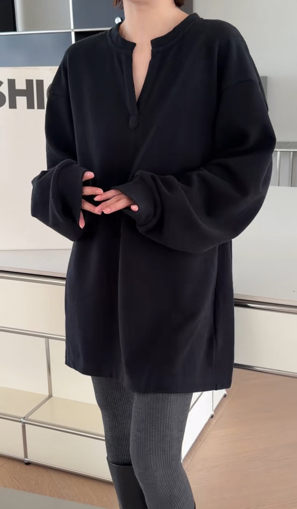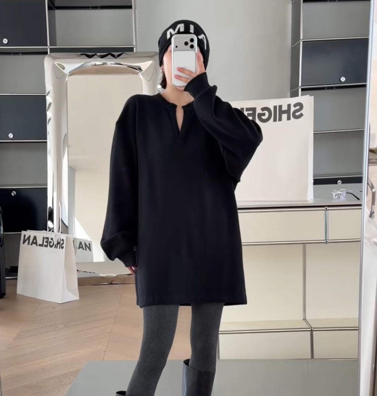 妍西家 诗歌兰女装25秋冬款25560百搭黑色V领中长款加厚长袖T恤女