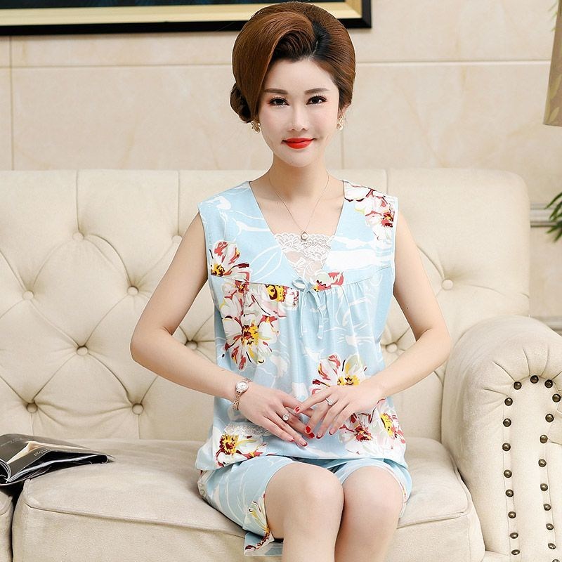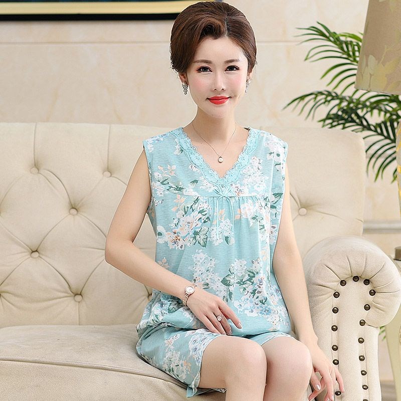 中老年睡衣女夏棉质背心七分裤中年妈妈加肥加大码无袖家居服套装