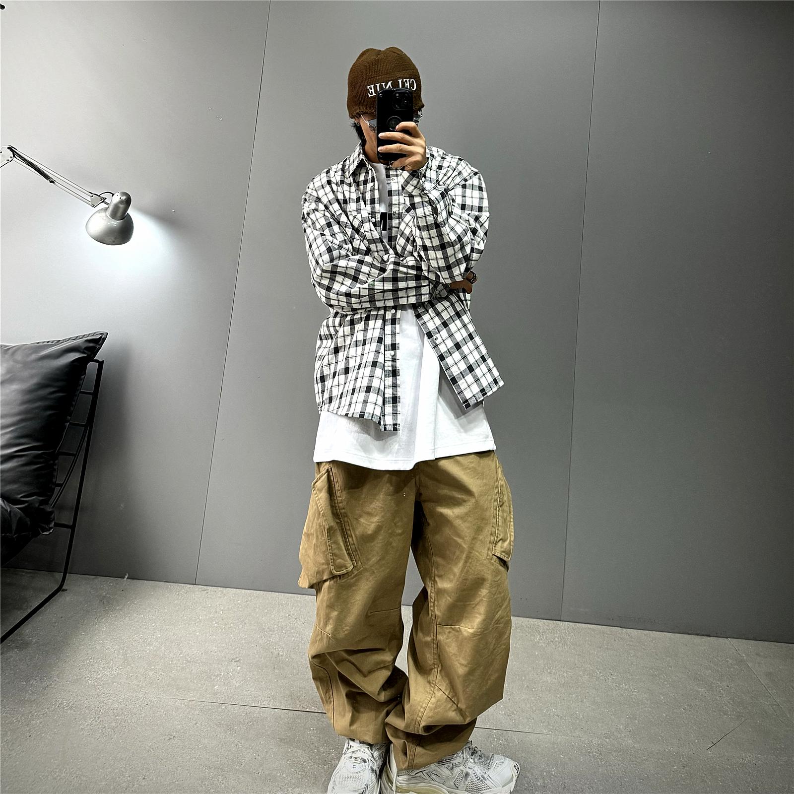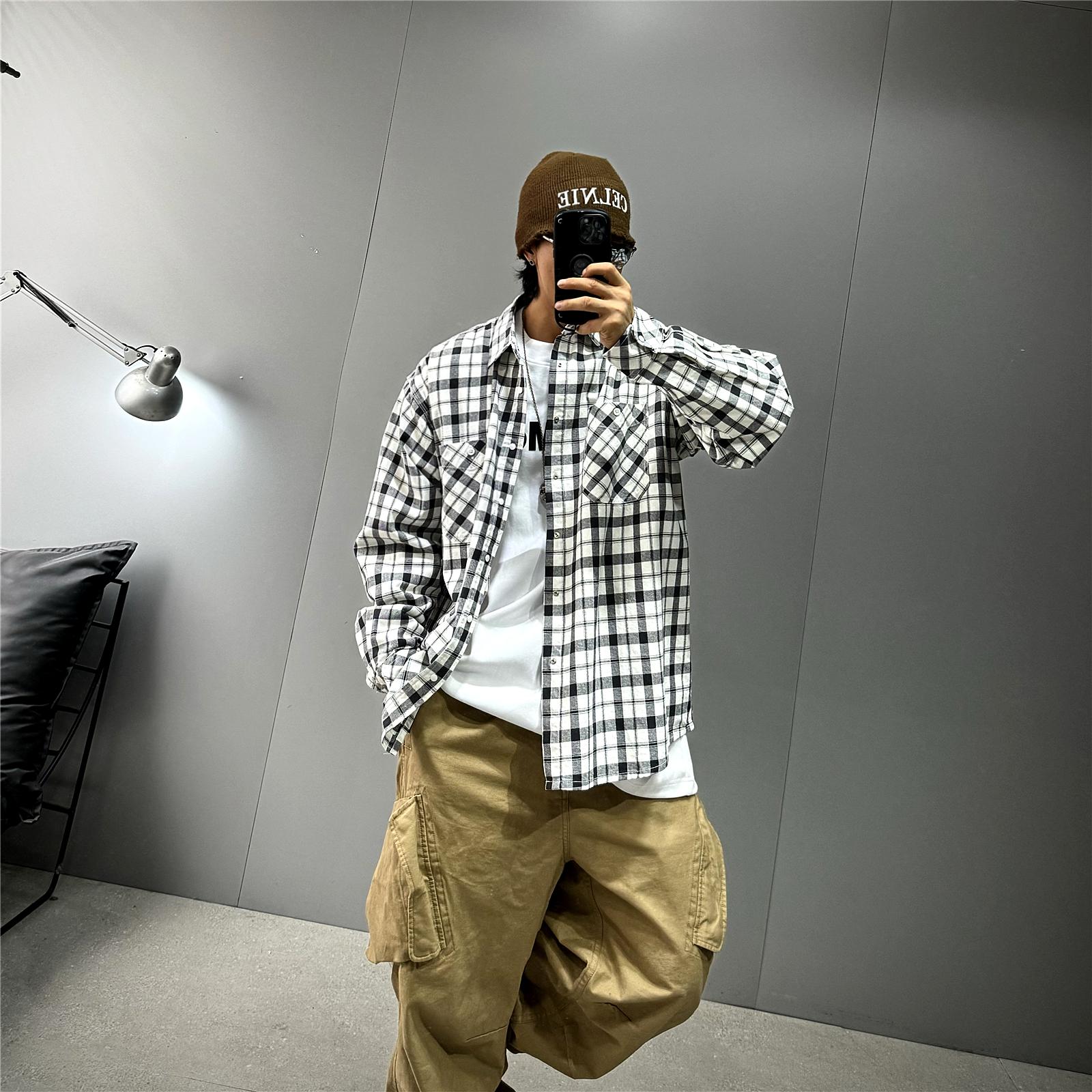 OOTD经典黑白灰棋盘格子长袖衬衫男美式潮牌宽松休闲百搭衬衣外套