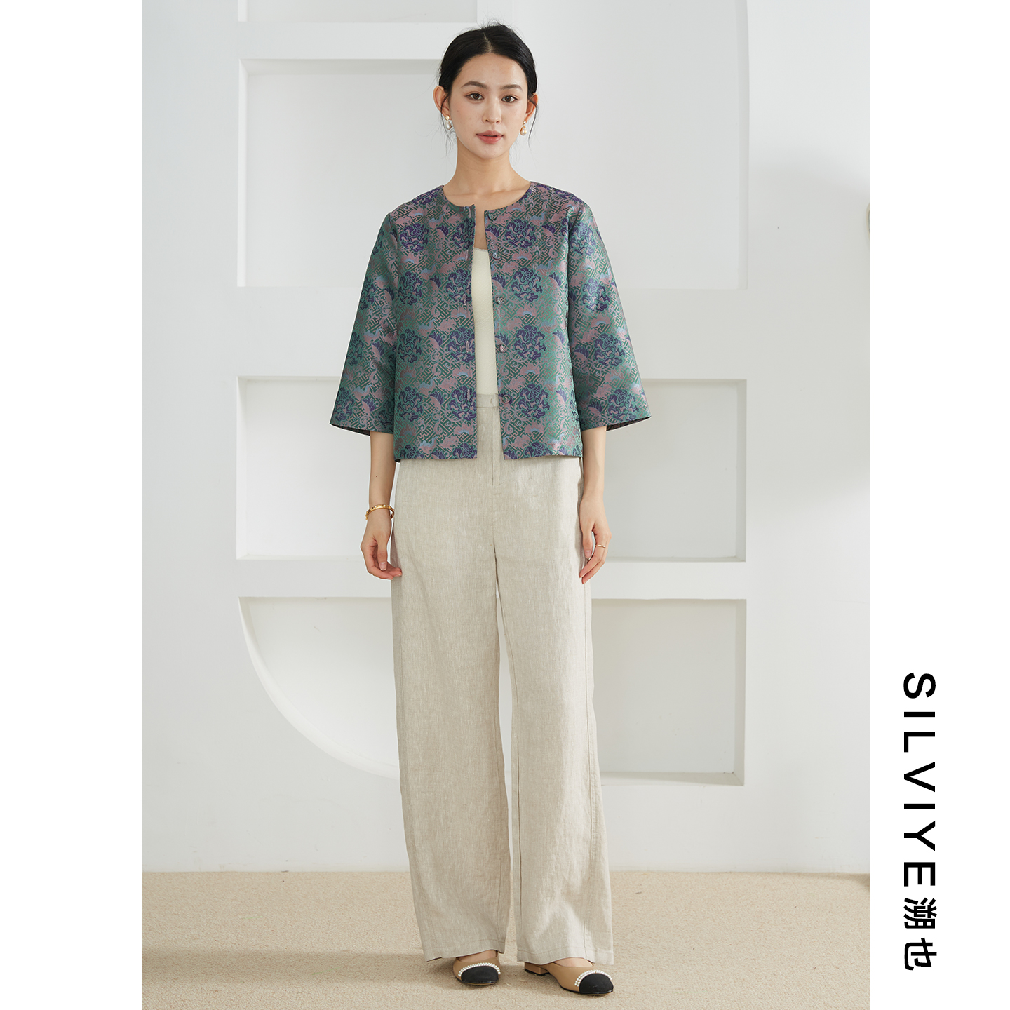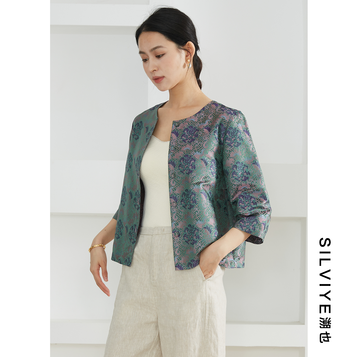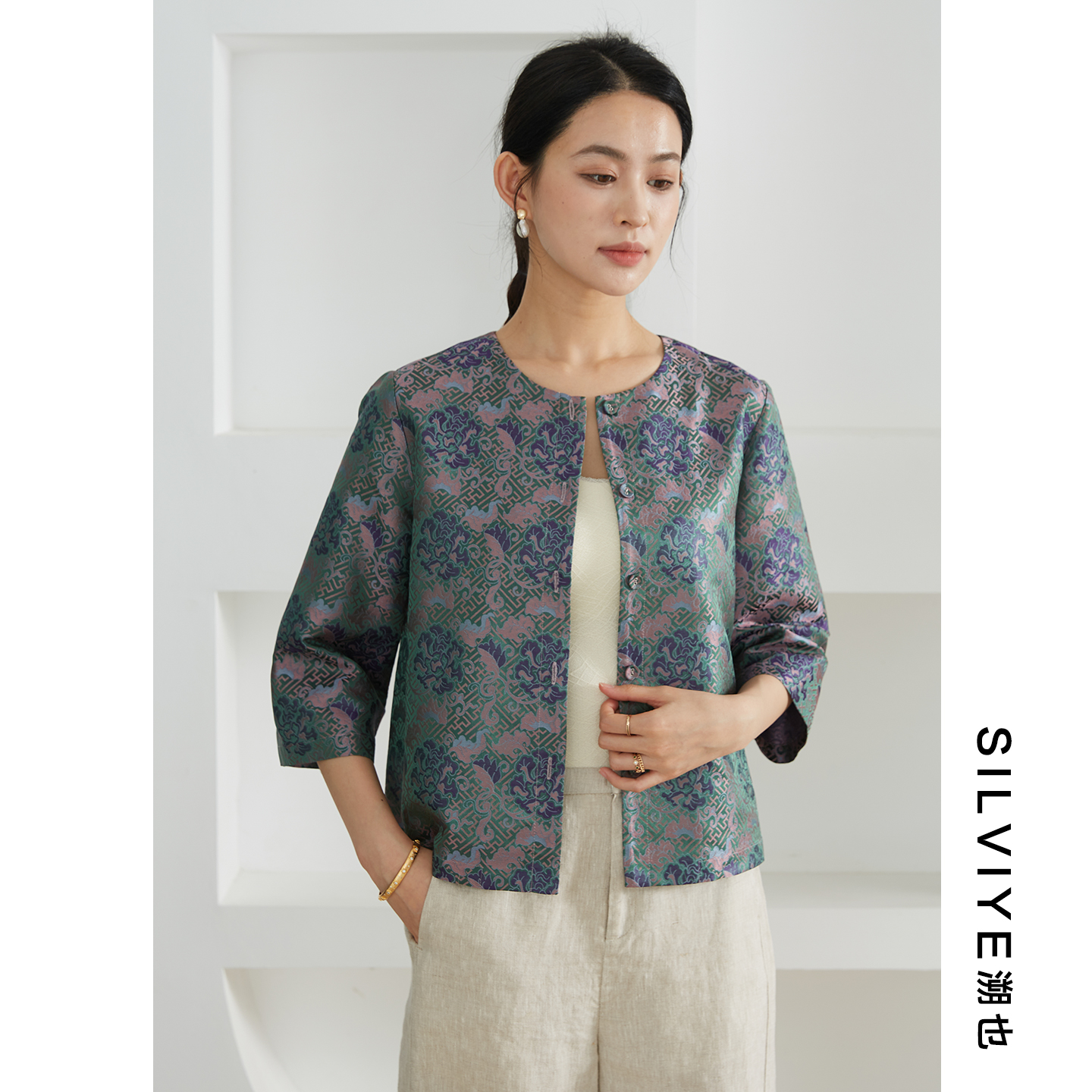 SILVIYE/溯也宋锦提花真丝上衣女100%桑蚕丝圆领七分袖外套开衫秋