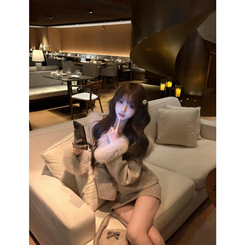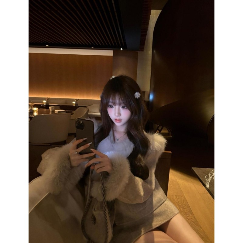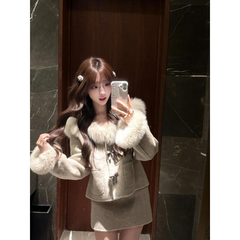 时尚套装秋季新款名媛千金气质蝴蝶结毛呢外套灰色半身裙两件套女