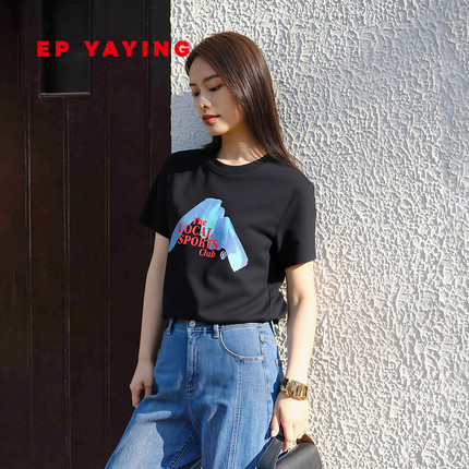 EP雅莹2025新款女装 绒绒棉圆领正肩字母印花短袖T恤上衣5313A