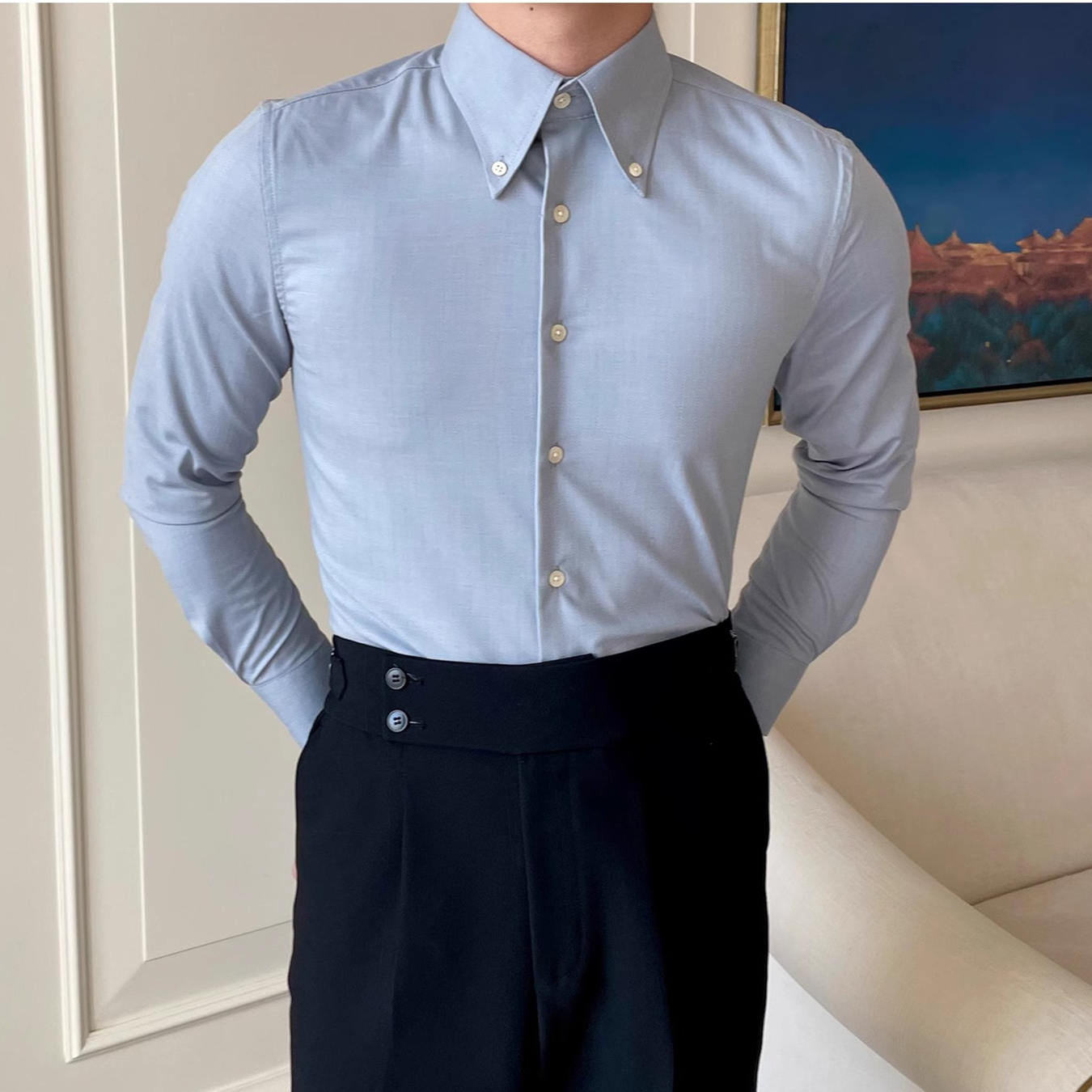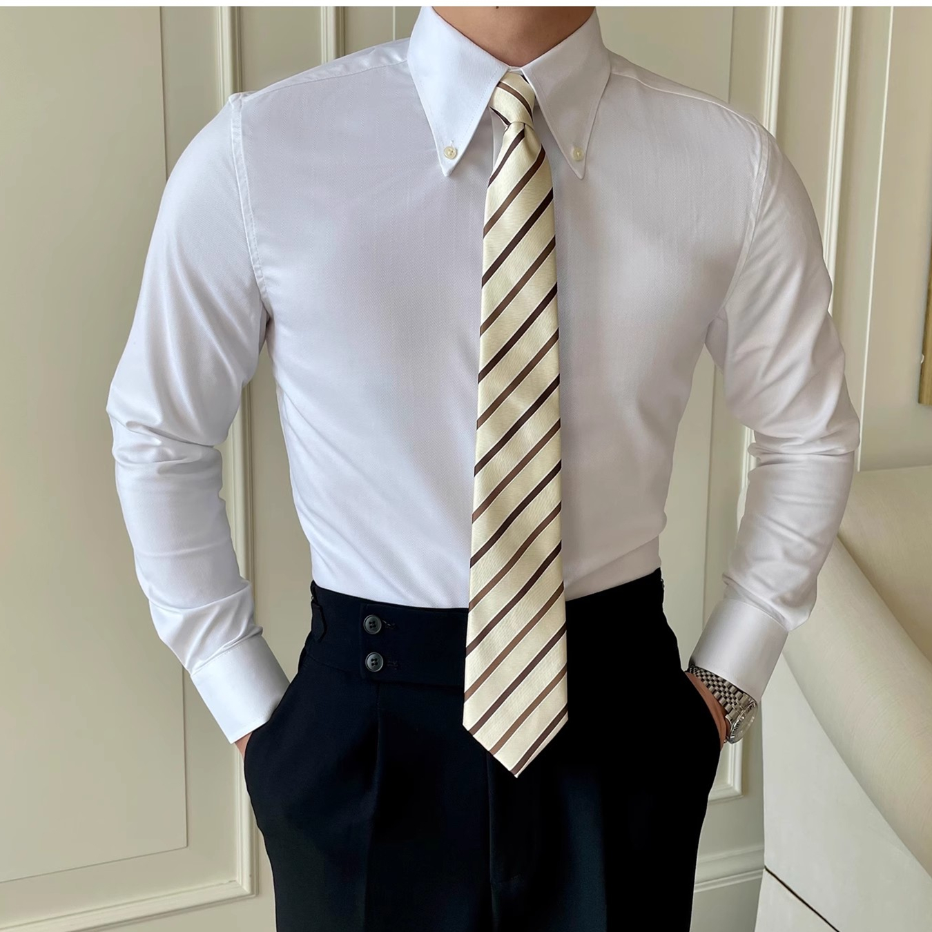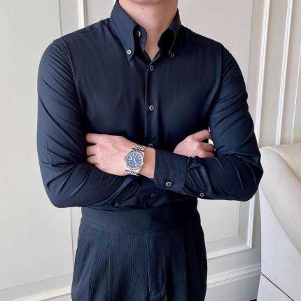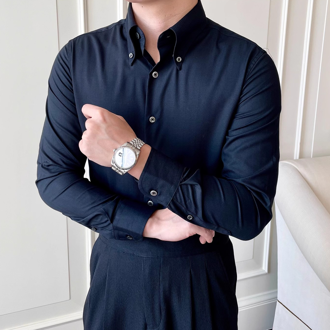 春夏新款英伦简约纯色百搭尖领长袖衬衣男韩版修身通勤纽扣衬衫潮