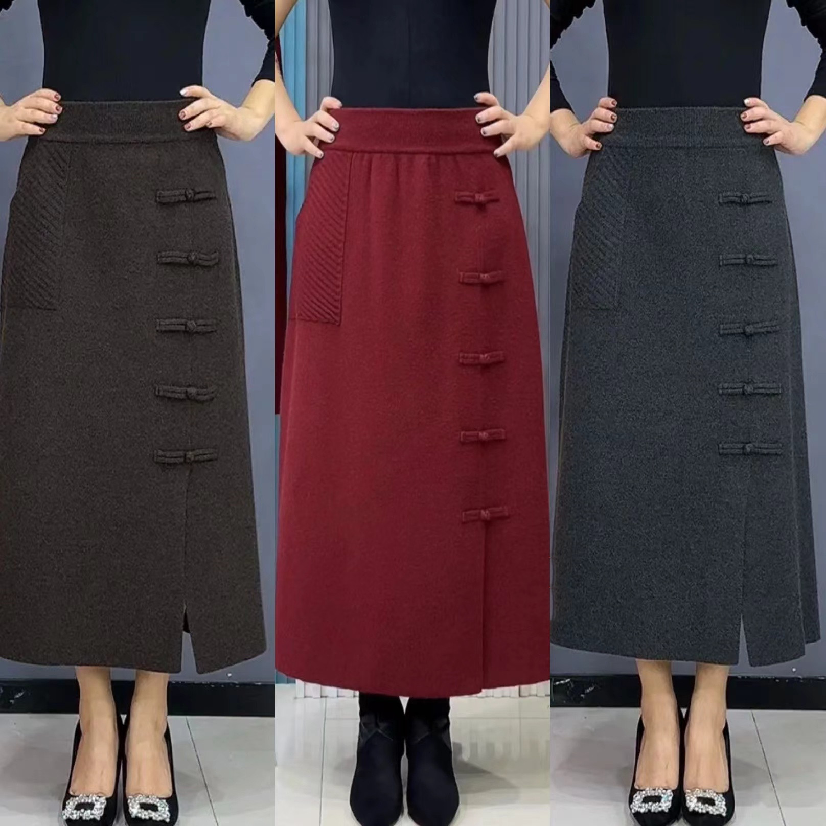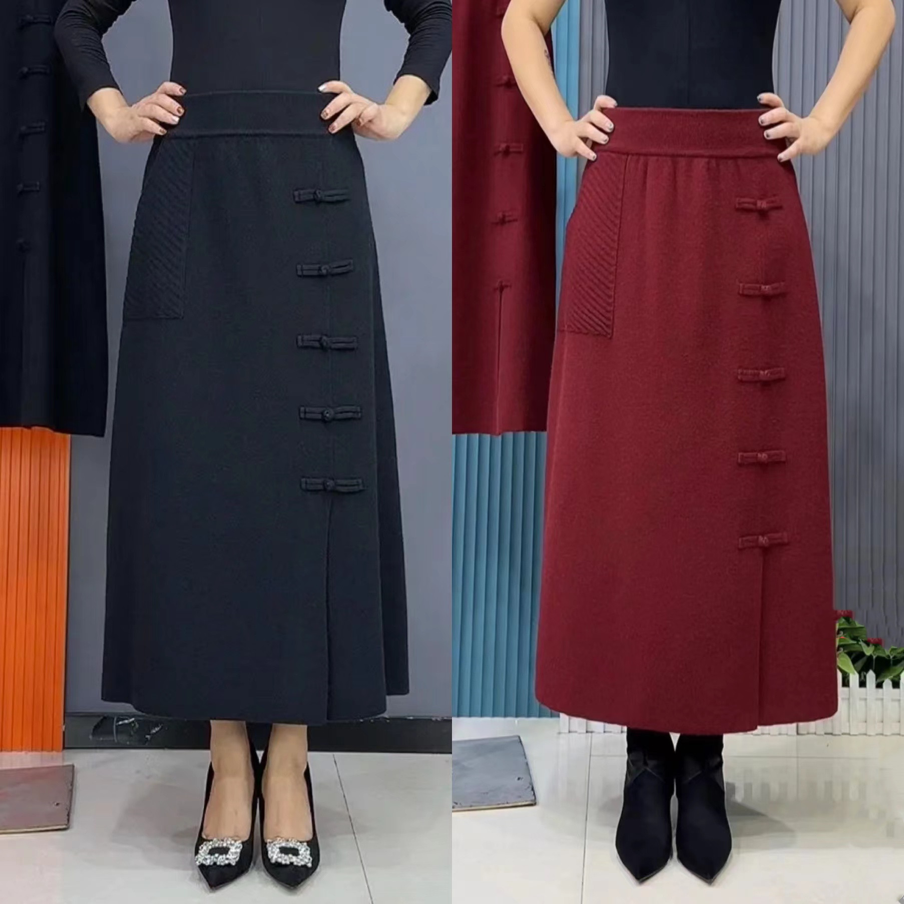 秋冬开叉半身裙羊绒柔软弹力显瘦古A版气质国风盘扣中长款裙子女