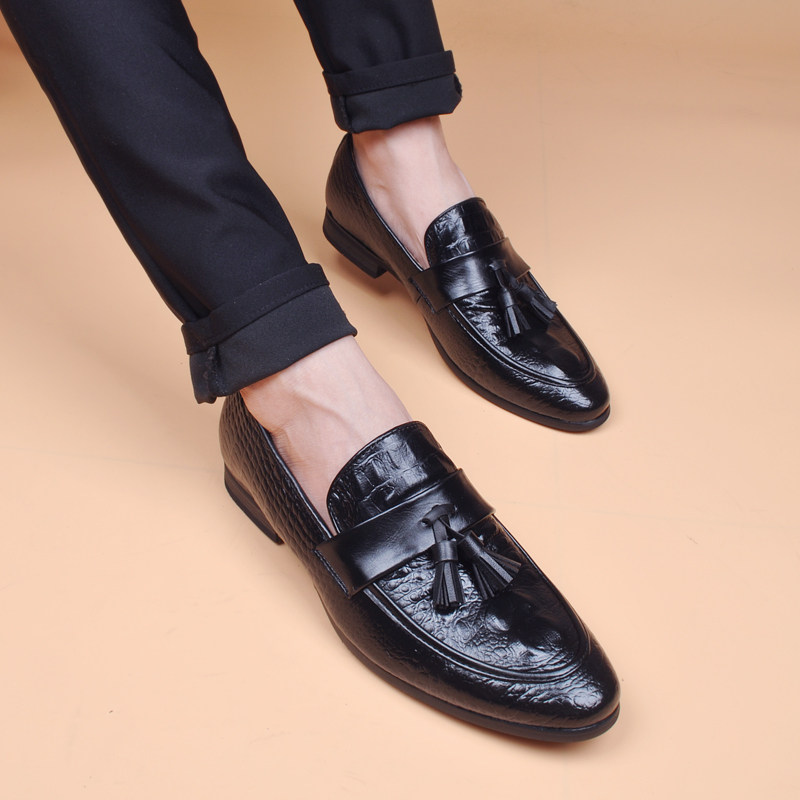 韩版潮流男鞋子鳄鱼纹雕花尖头皮鞋一脚蹬透气春夏新款休闲皮鞋黑