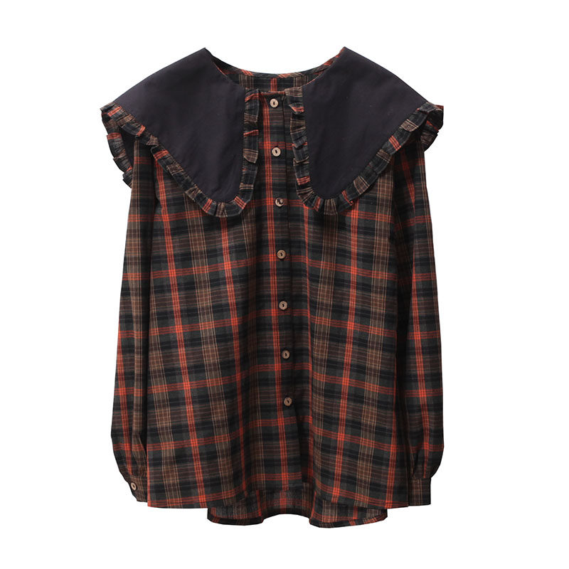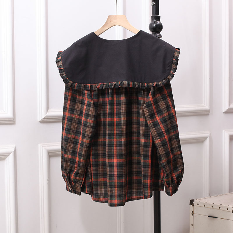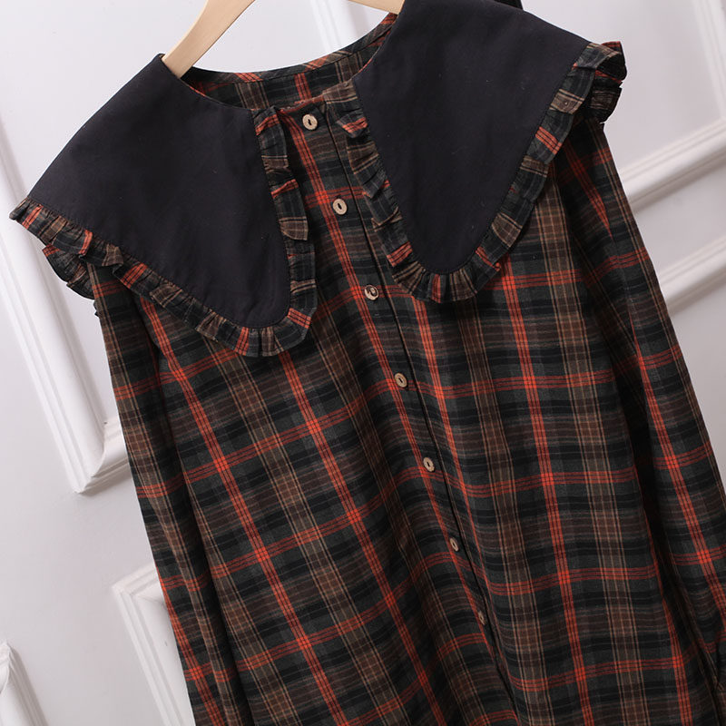 宽松复古衬衫长袖棉格子娃娃领