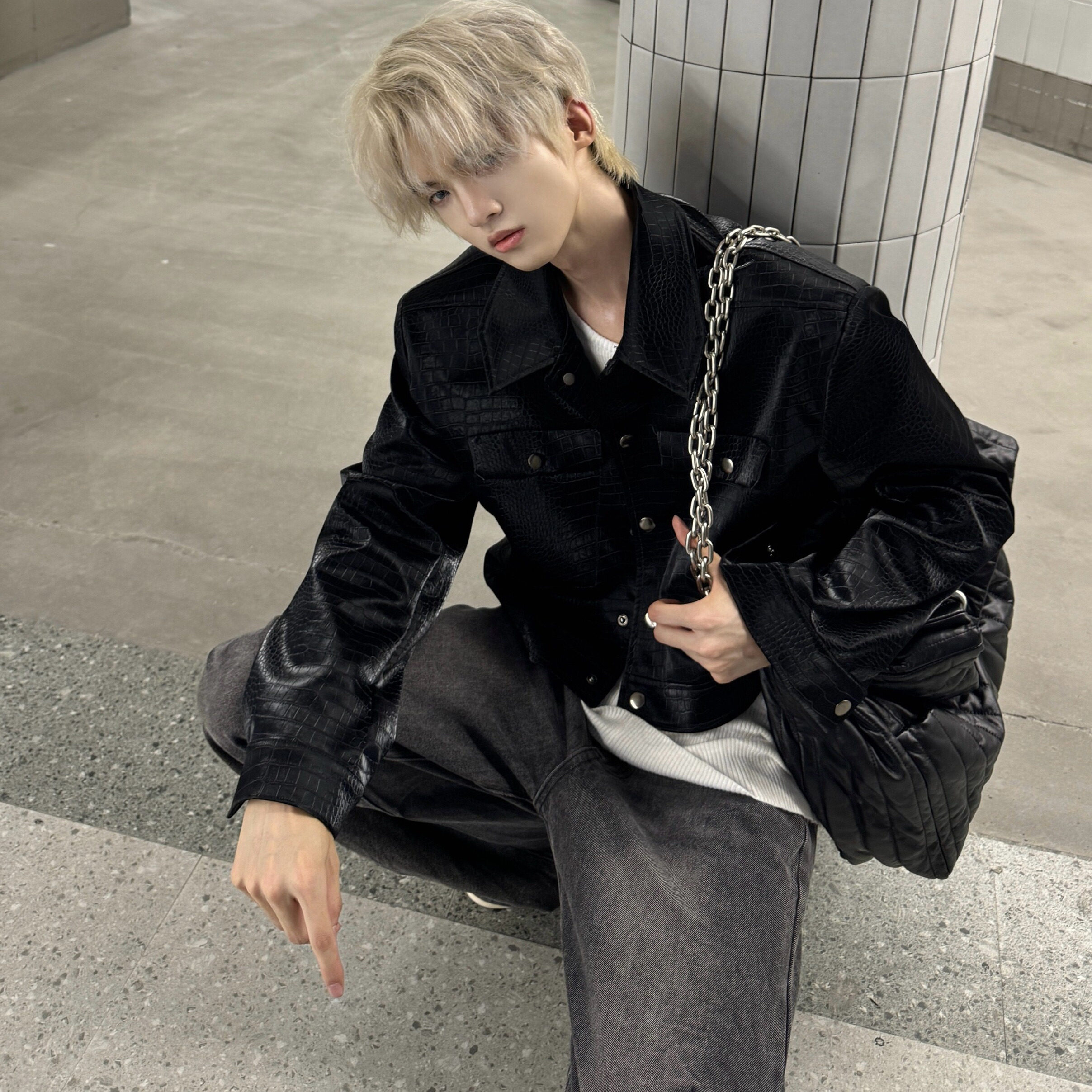 Desaturate原创重磅环保鳄鱼纹修身夹克短款外套PU皮衣男女