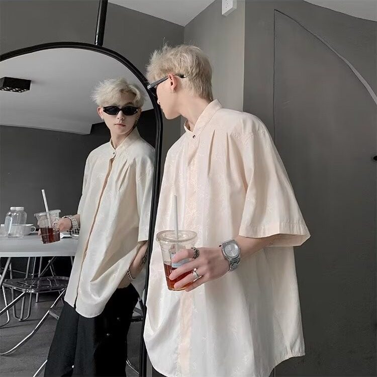 粉色短袖衬衫男夏季薄款中国风潮牌暗纹高街痞帅立领冰丝衬衣外套