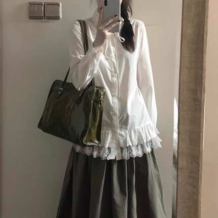 法式polo领衬衫女秋冬设计感拼接蕾丝下摆长袖宽松甜美学院风衬衣