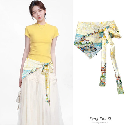 油画风不规则三角巾春夏半身裙女裙帘腰带巾仿丝叠穿短裙屁帘新款
