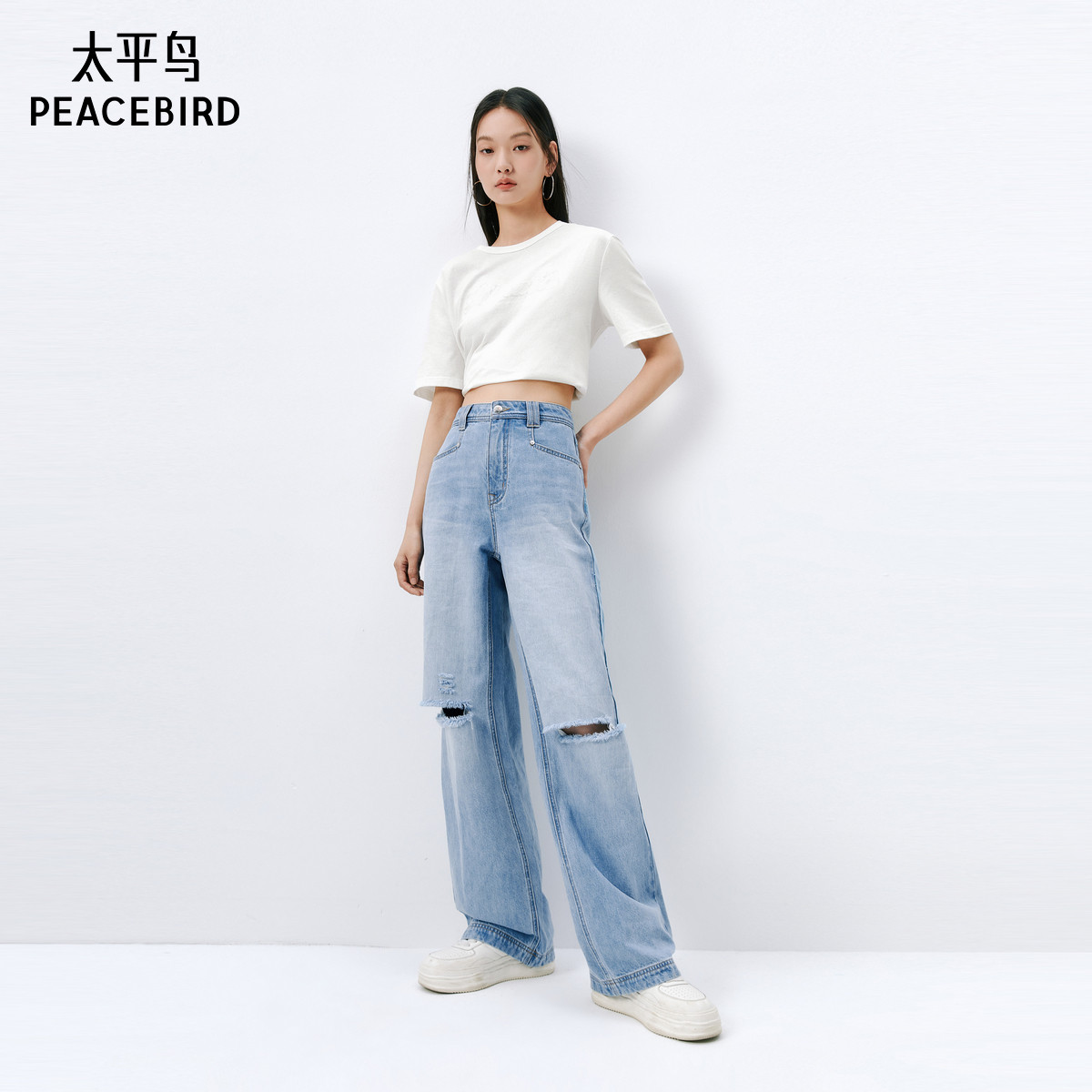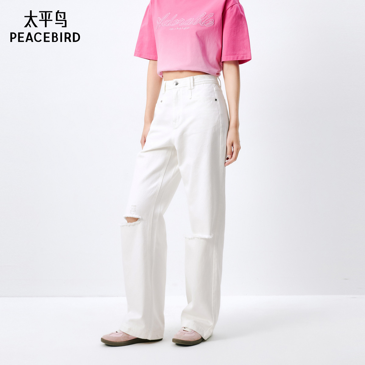 太平鸟高腰破洞直筒牛仔裤2025年春季款宽松显瘦个性阔腿裤子女