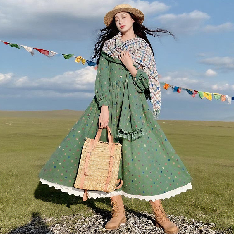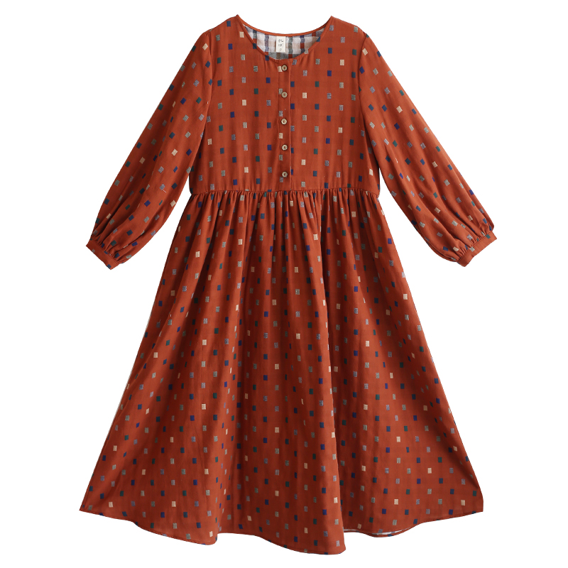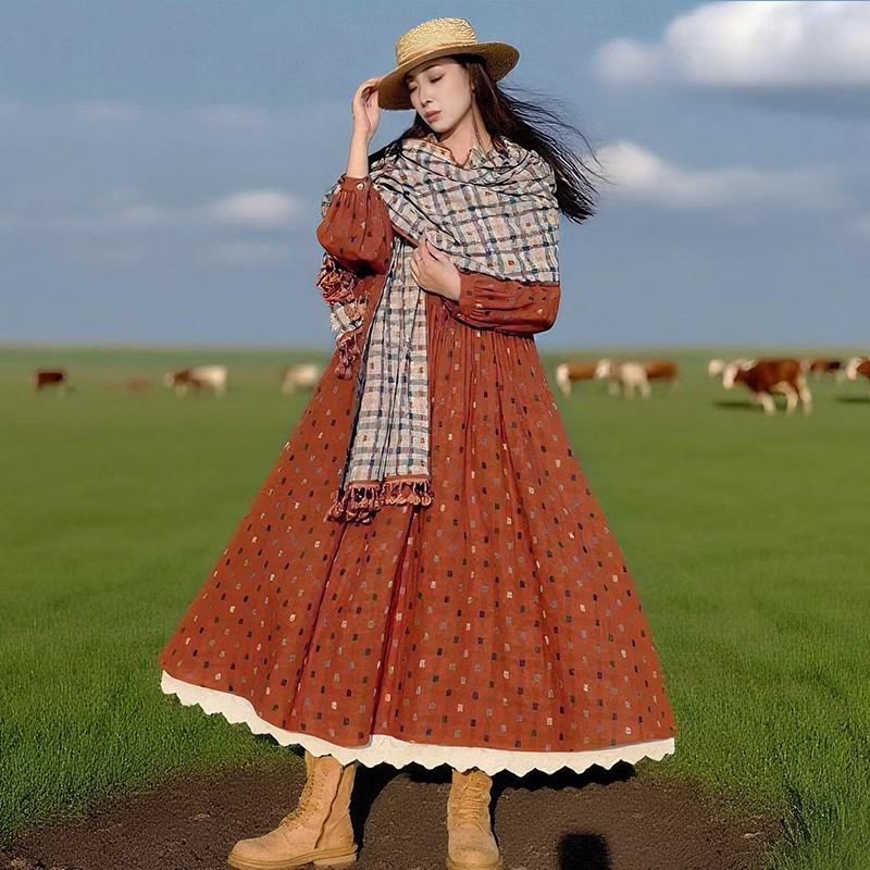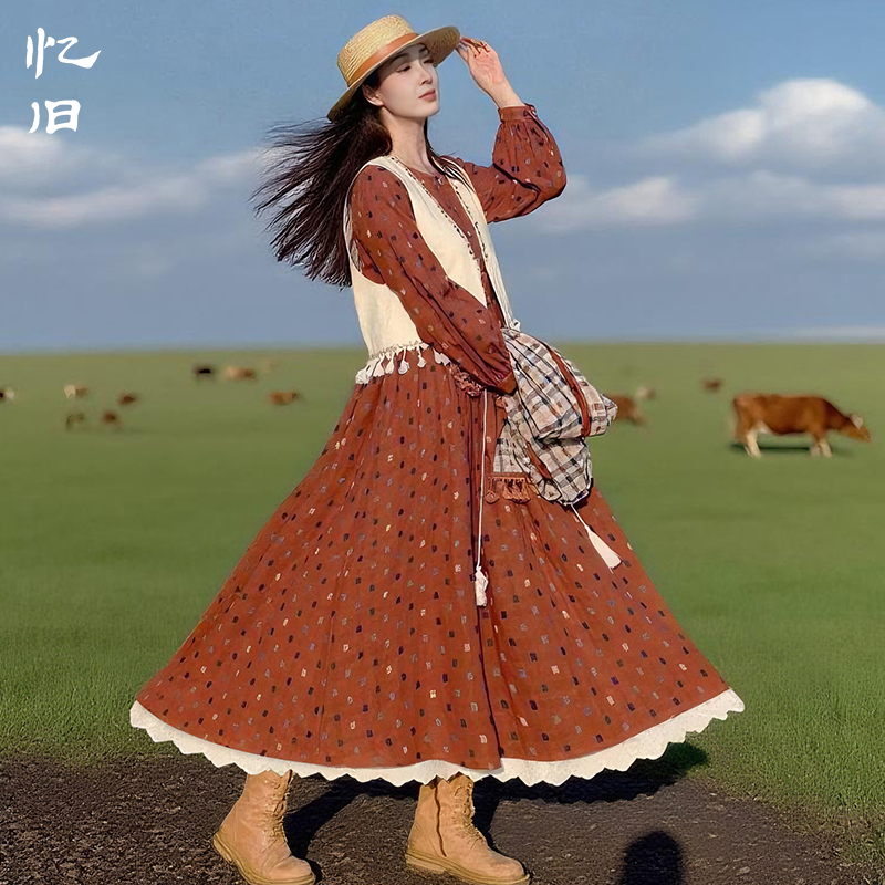 【日落的糖】复古灯笼袖大摆连衣裙女秋季复合色织棉宽松裙送披肩