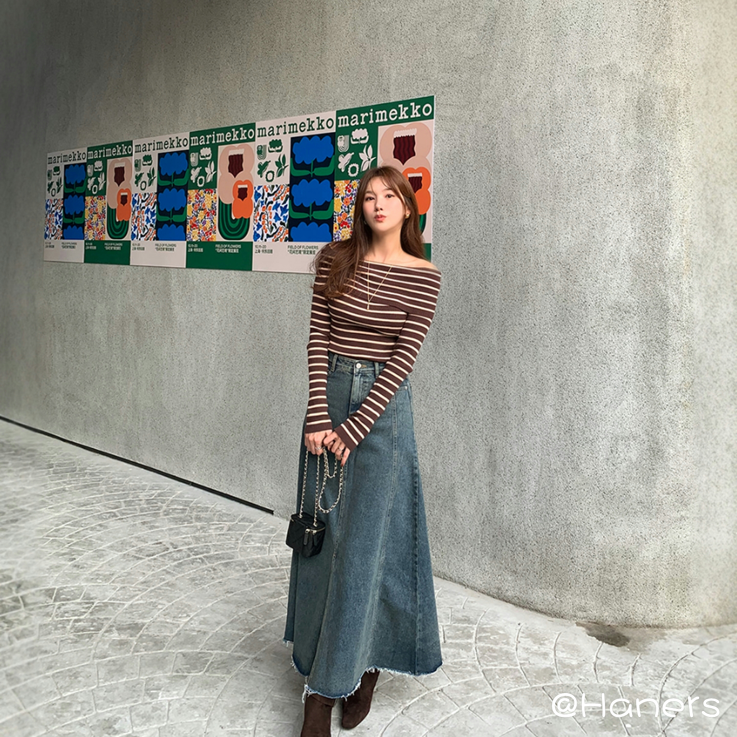 Haners家韩代购女时髦大气2025秋冬新品时尚条纹露肩针织上衣