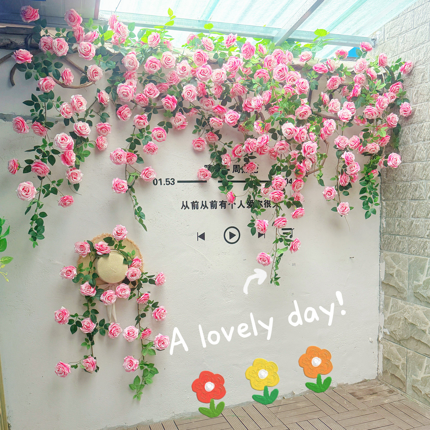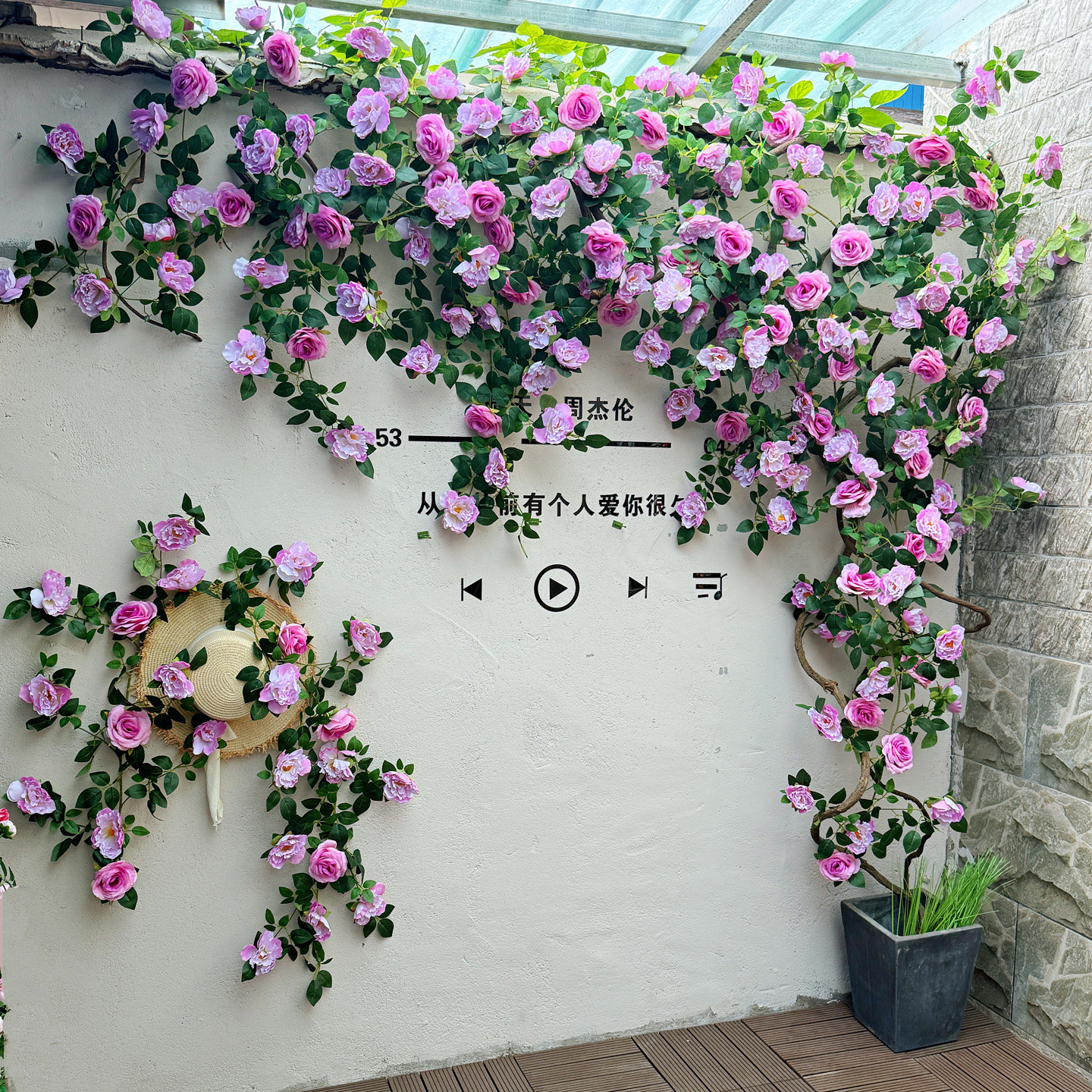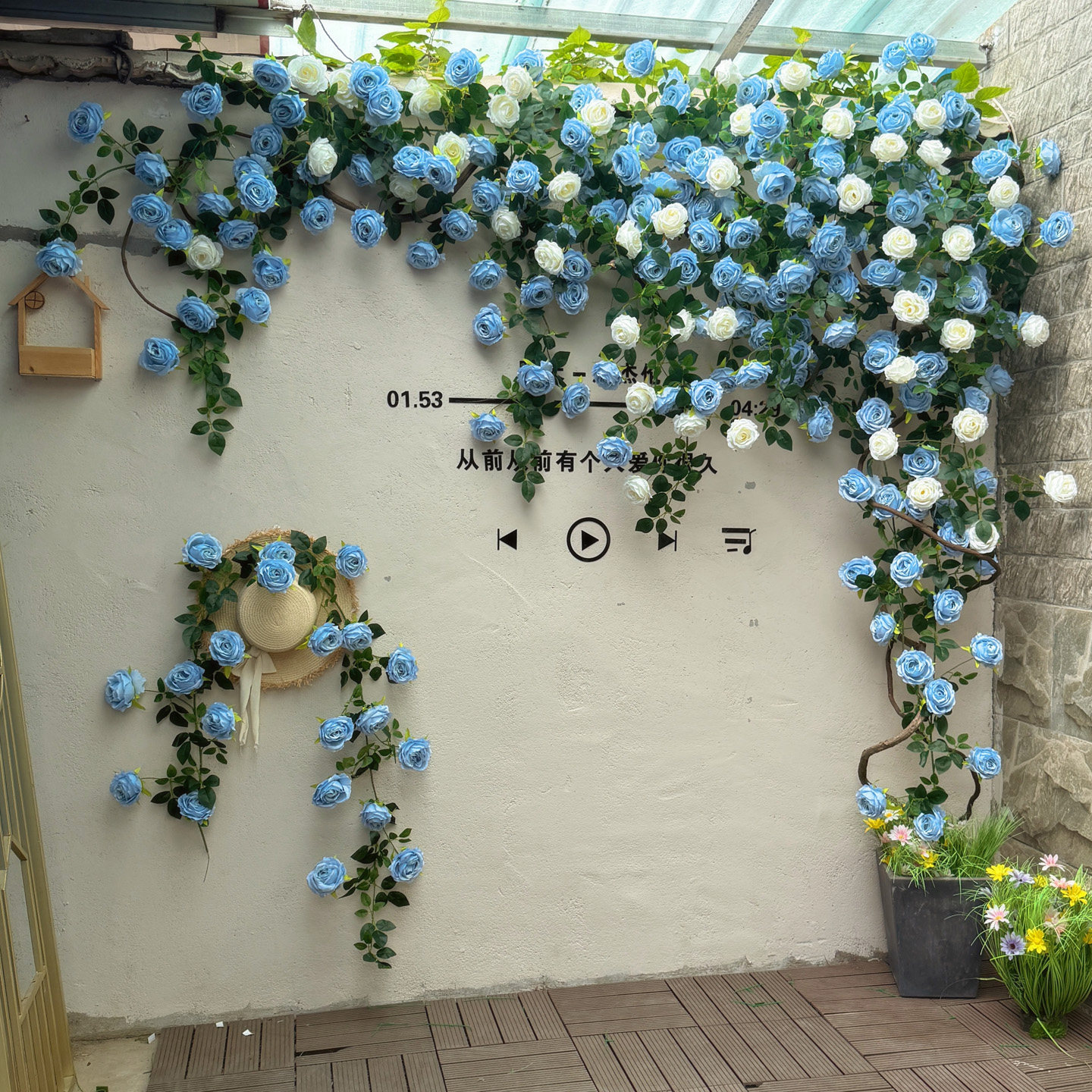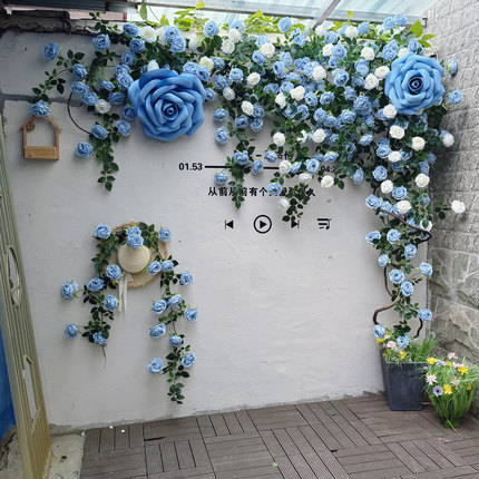 复古风仿真玫瑰花藤蔓装饰花墙造景布置背景墙蓝色白色系网红打卡