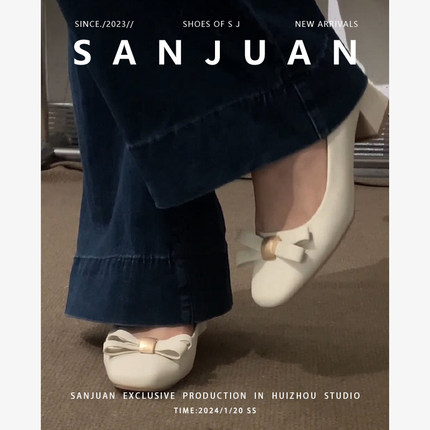 羊皮版sanjuan三卷小皮鞋粗跟单鞋中跟白色高跟鞋方头法式通勤鞋