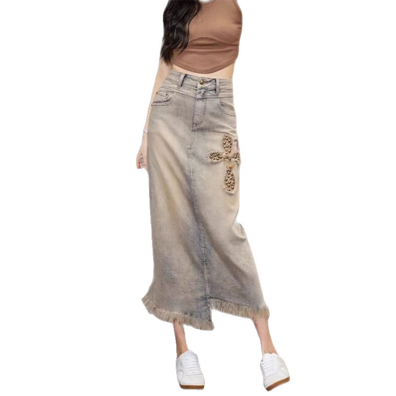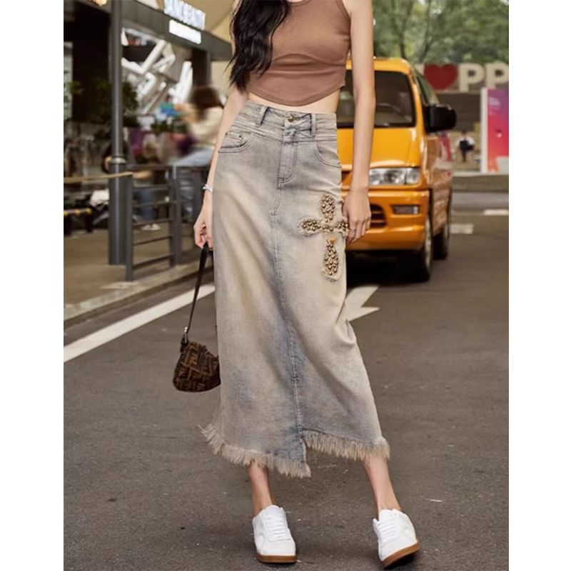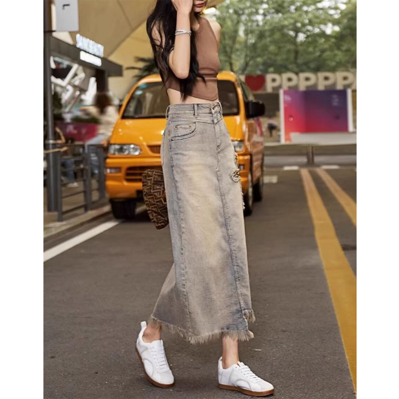 女士高腰牛仔半身裙中长裙2025春季新款不规则毛边后开叉一步裙子