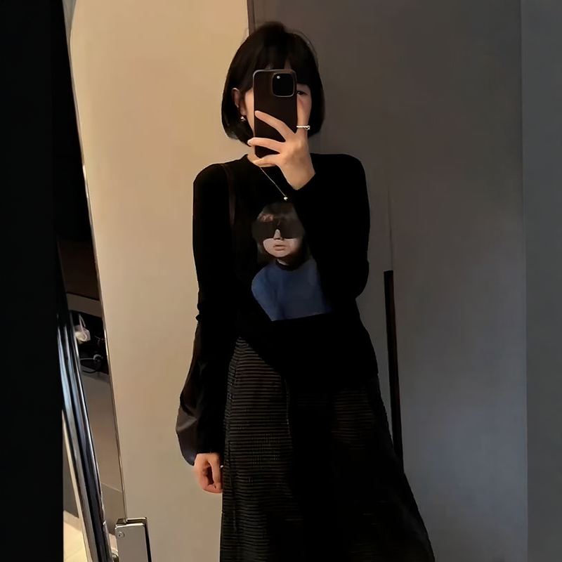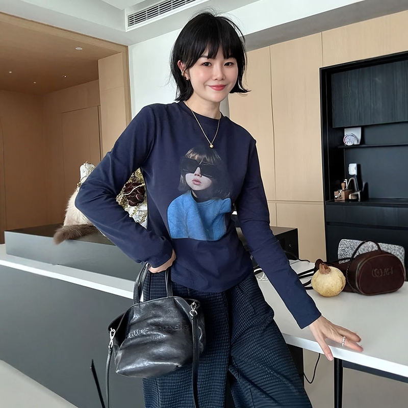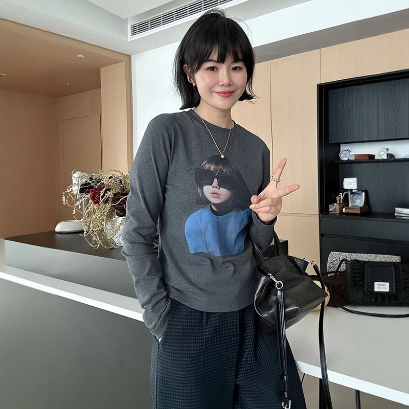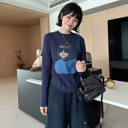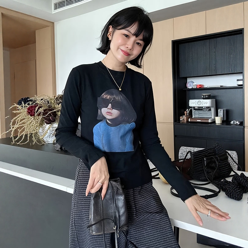 大码正肩圆领印花女孩长袖T恤女