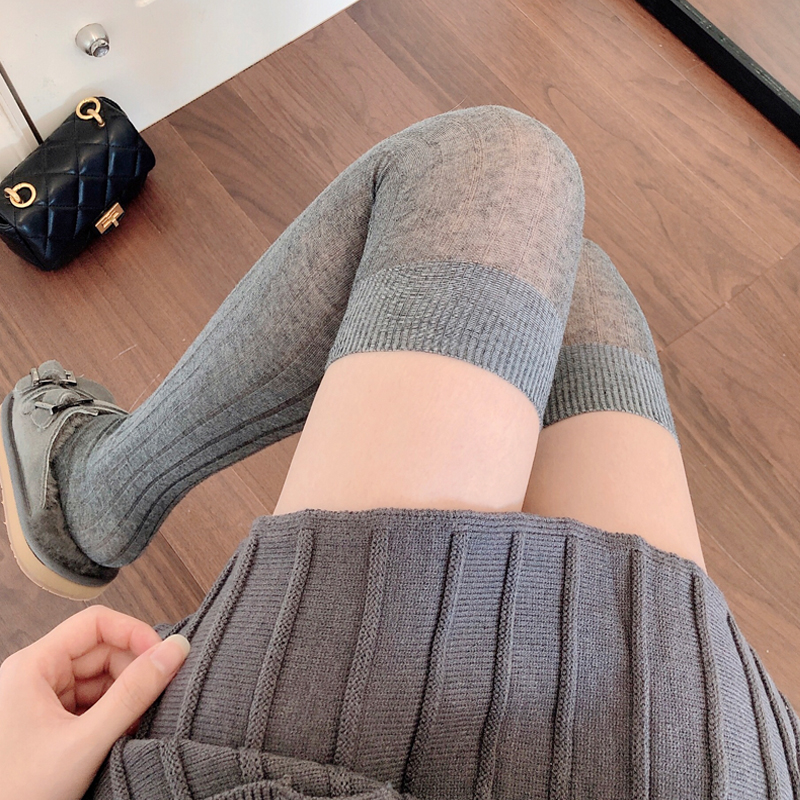 烟灰色过膝袜女春秋棉竖条纹及膝黑色中长筒袜米白色大腿袜高筒袜