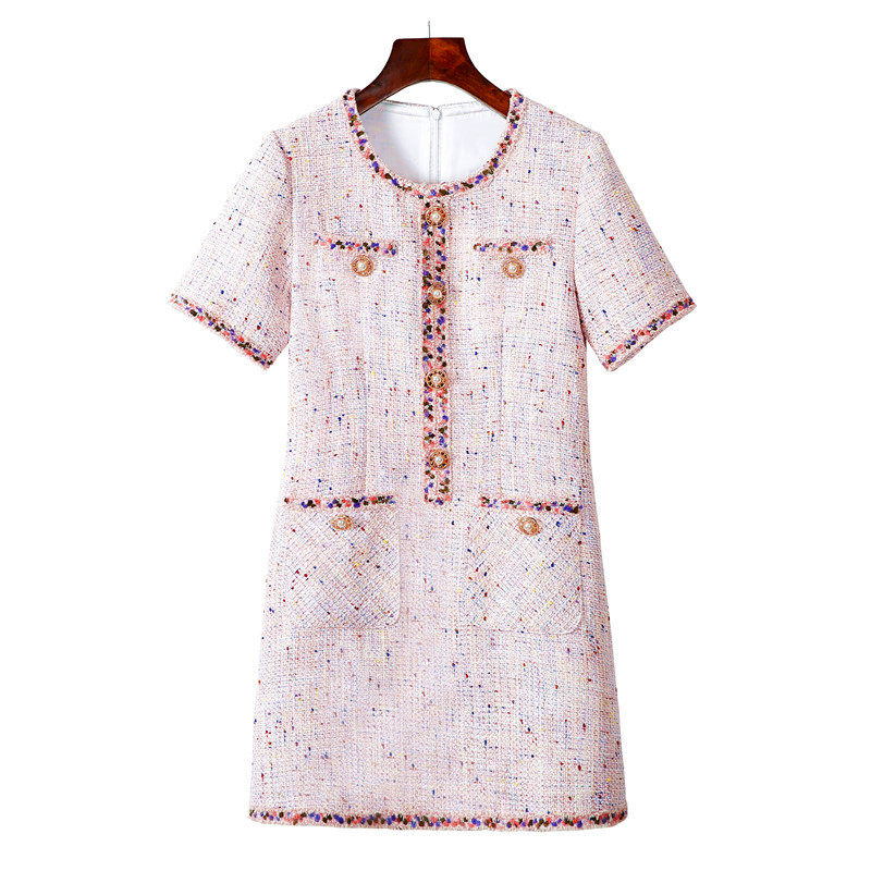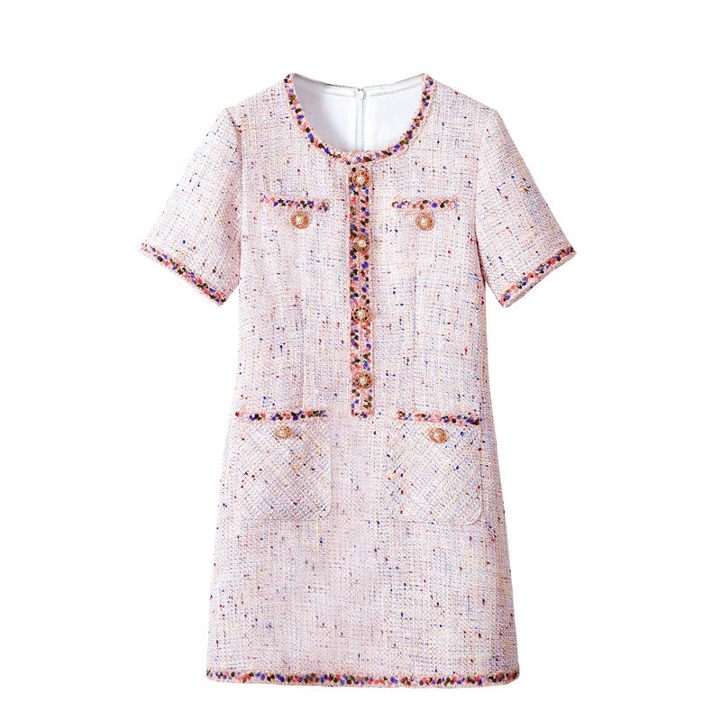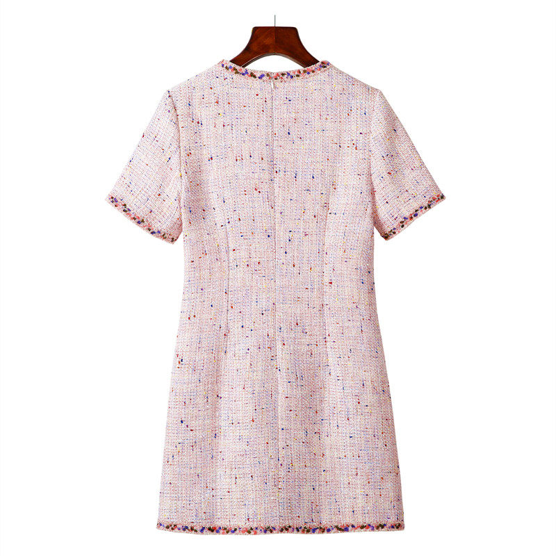 bonaiwei短袖小香风连衣裙女圆领夏秋减龄气质显瘦淑女粉色裙子