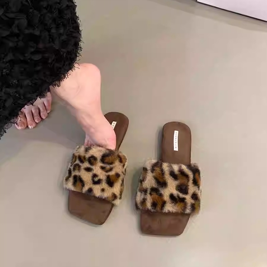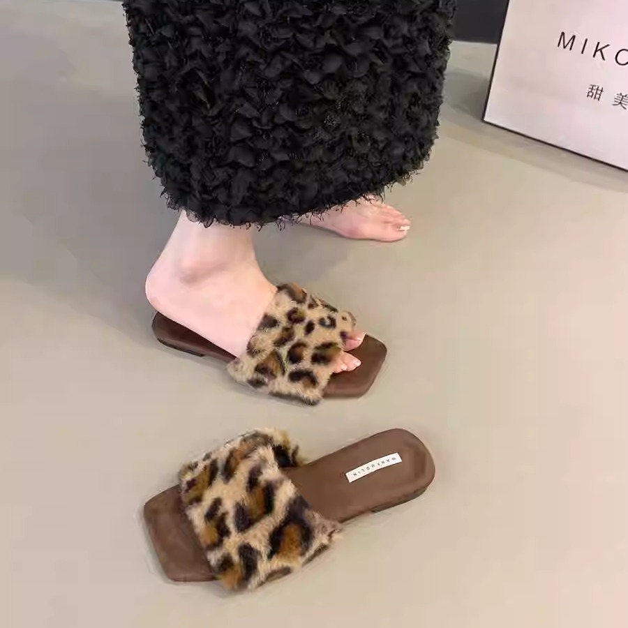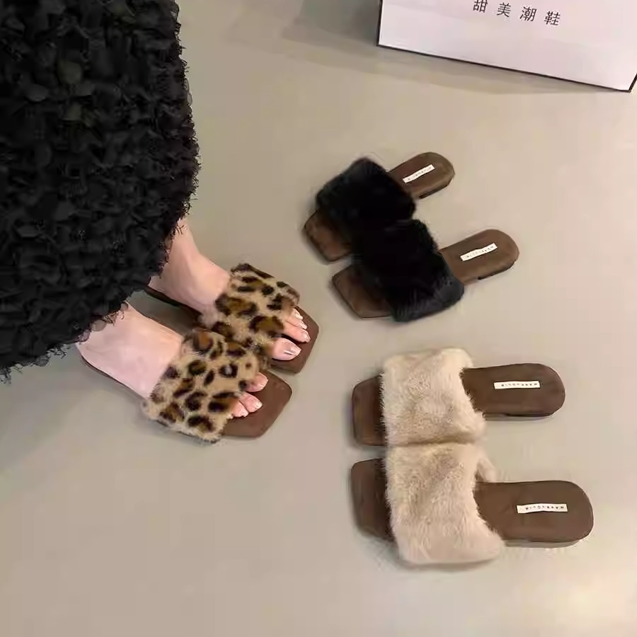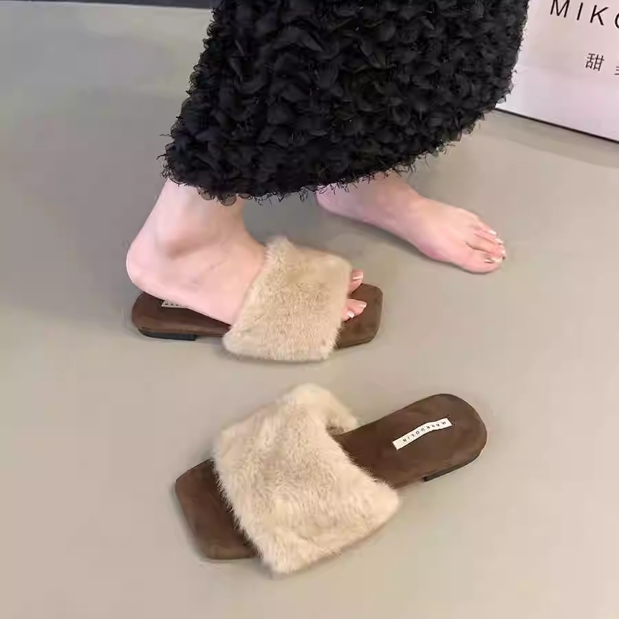 时尚休闲平底鞋毛毛鞋女鞋子2025早秋新款百搭一字拖毛毛拖棉拖鞋
