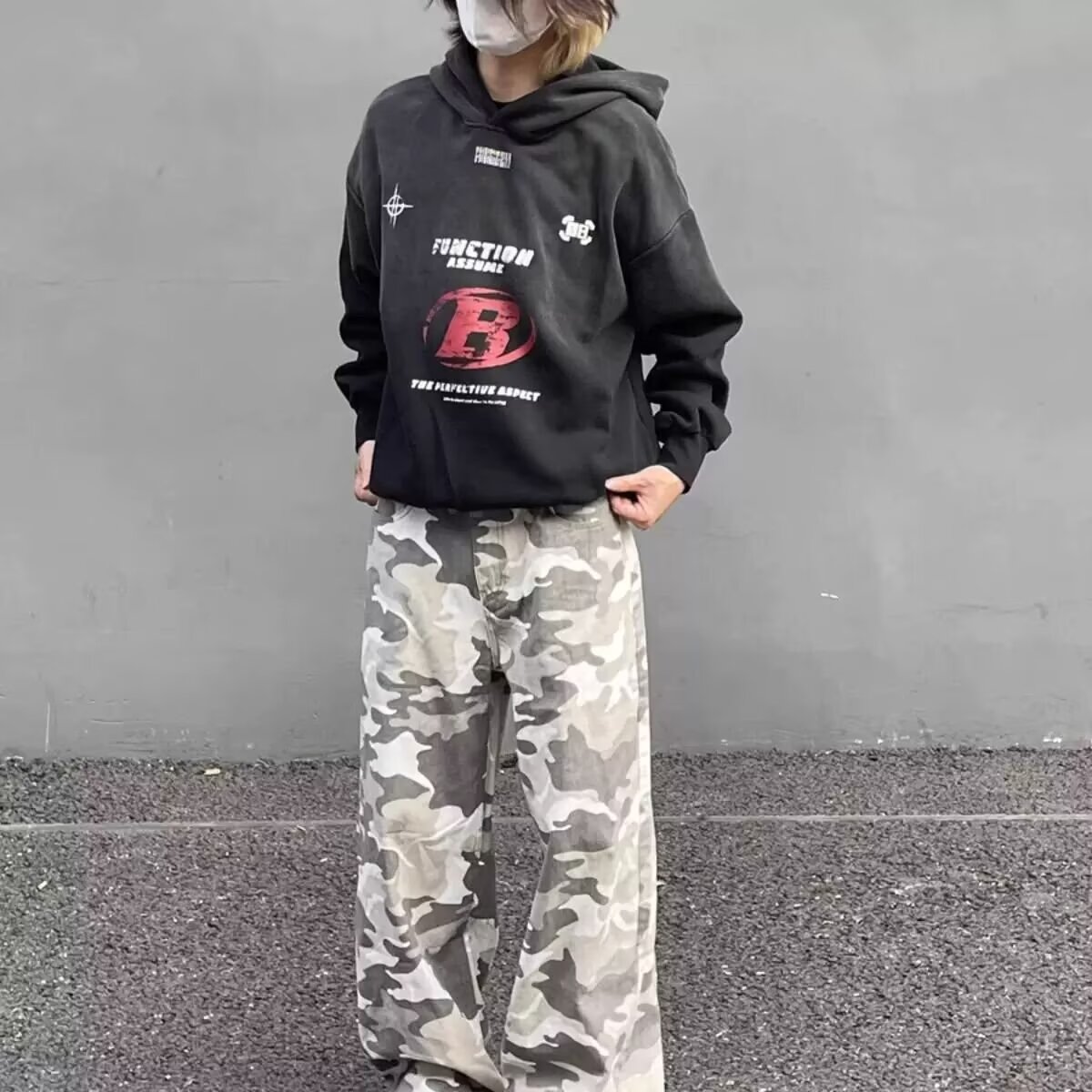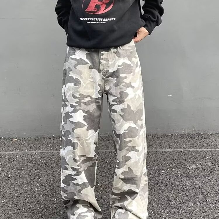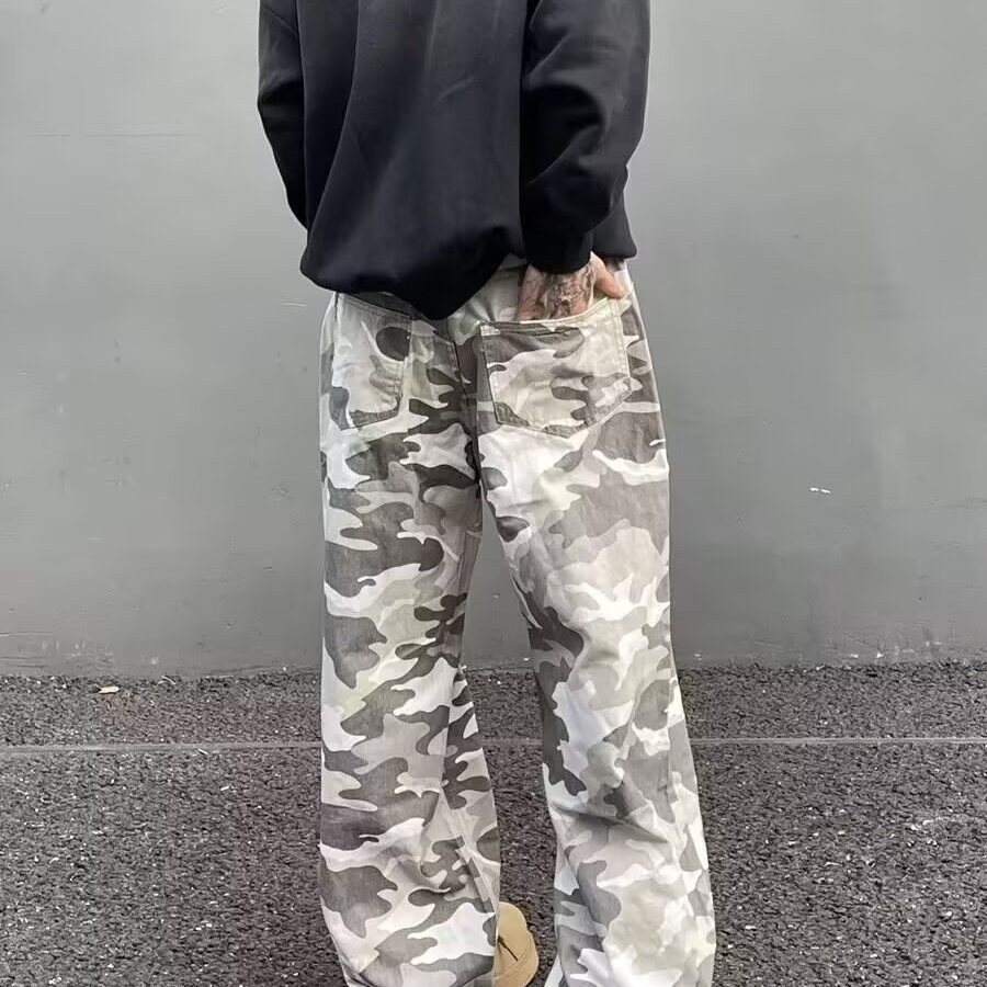 美式复古高街迷彩工装牛仔裤男潮牌痞帅cleanfit炸街宽松直筒长裤